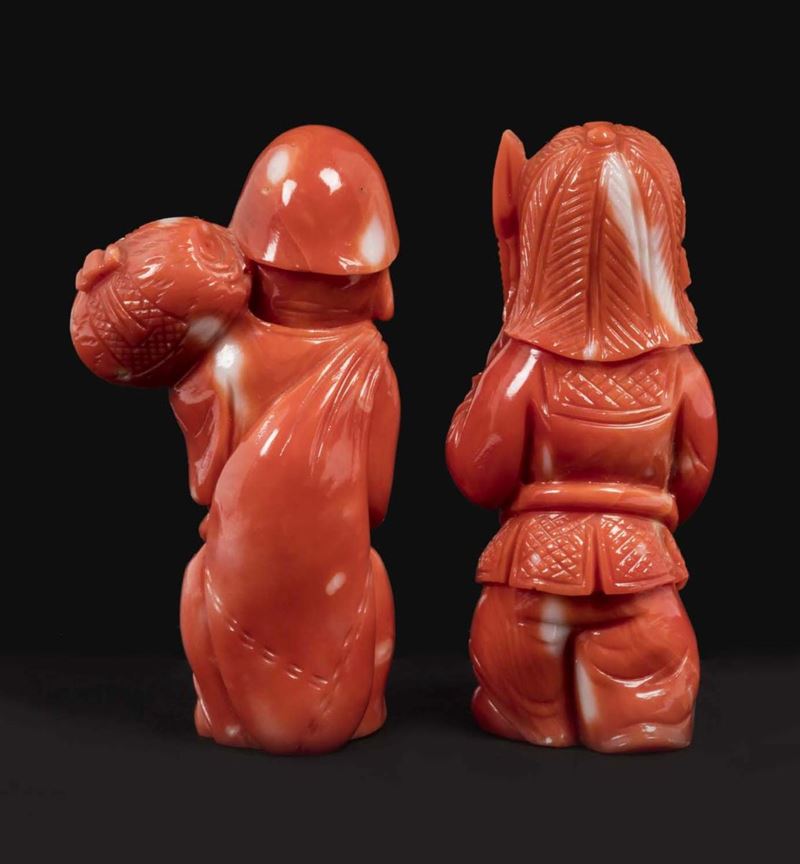Two small carved coral figures, a wise man with saddlebag and a warrior with spear, China, early 20th century