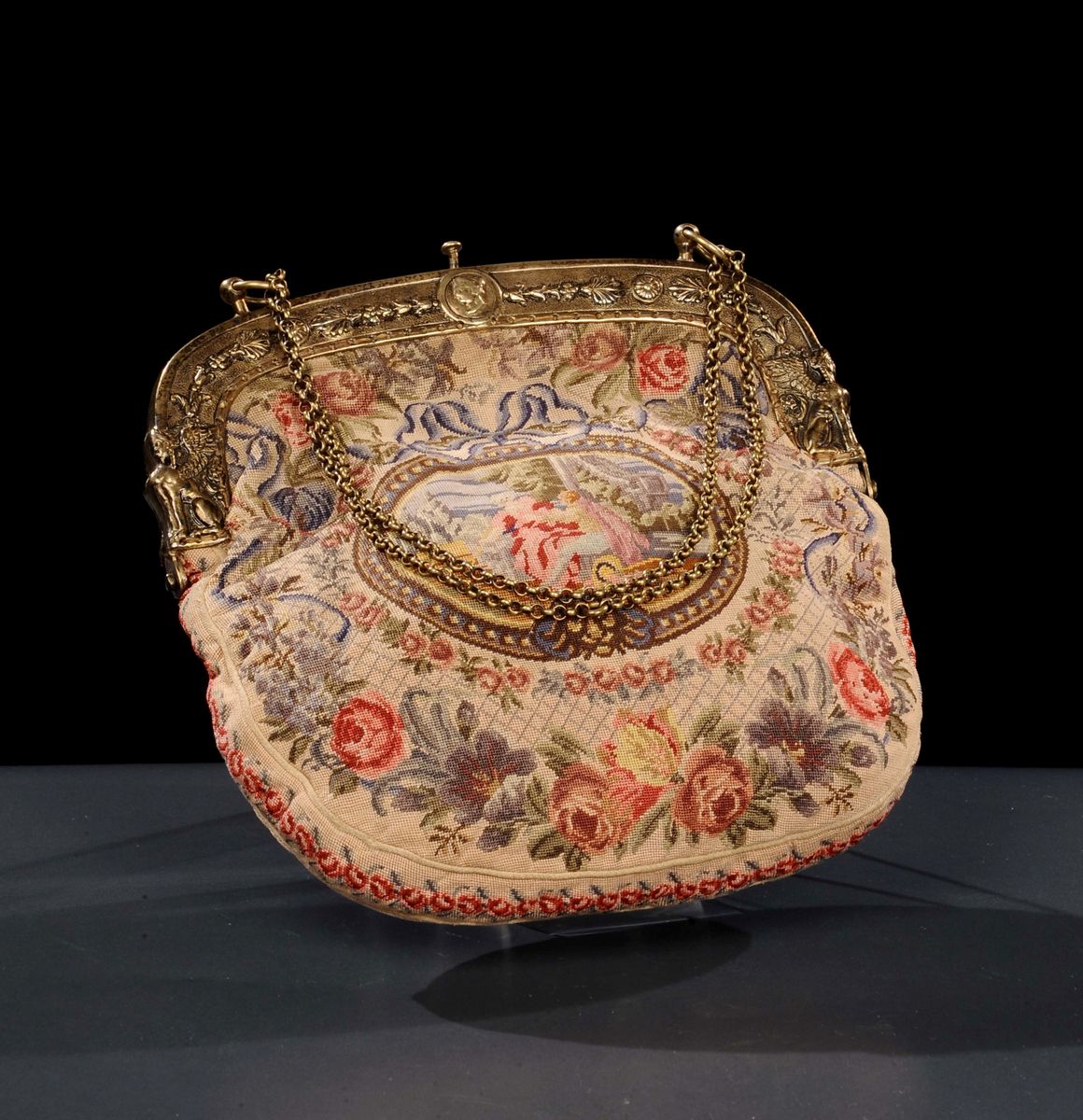 Piccola borsa ricamata con tessuto a piccolo punto, XVIII secolo