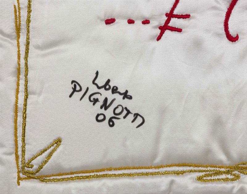 arazzo Quilt ricamato a mano, cm 52x49firmato e datato in basso a sinistraesemplare unico su bozzetto dell’artistaAutentica dell’artista su fotografia