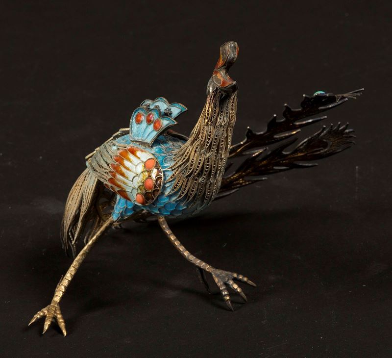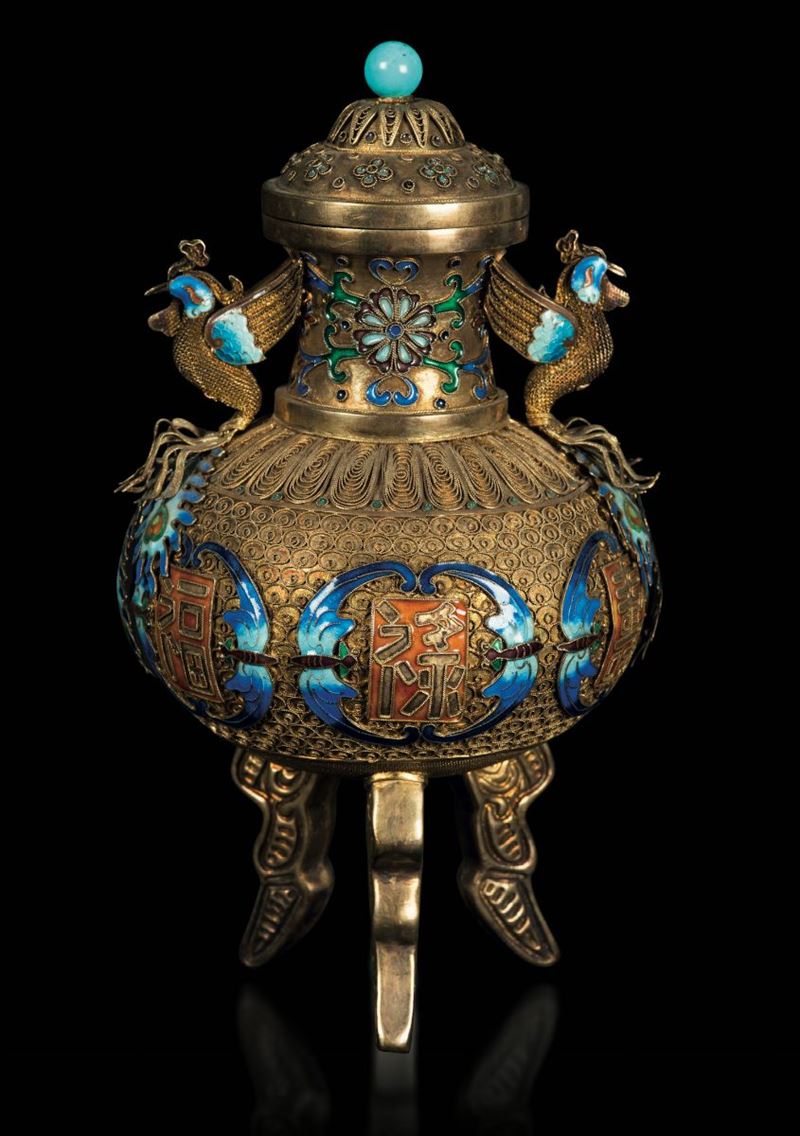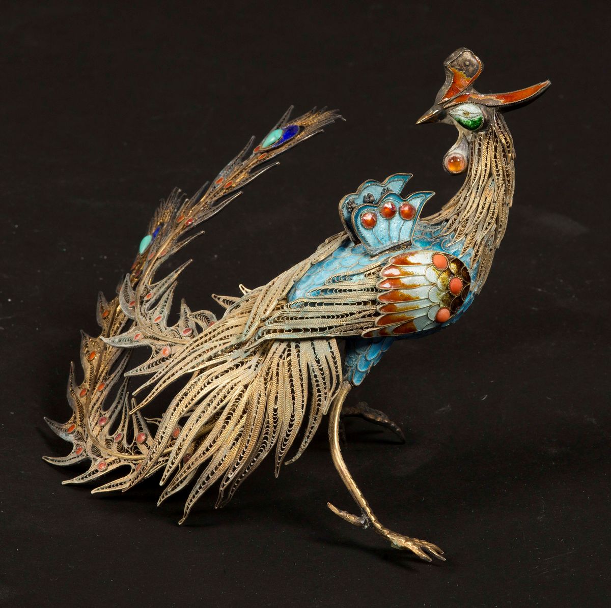 A lot made of a metal glazed figure of phoenix and a tripod gilt and glazed silver censer, China, early 20th century