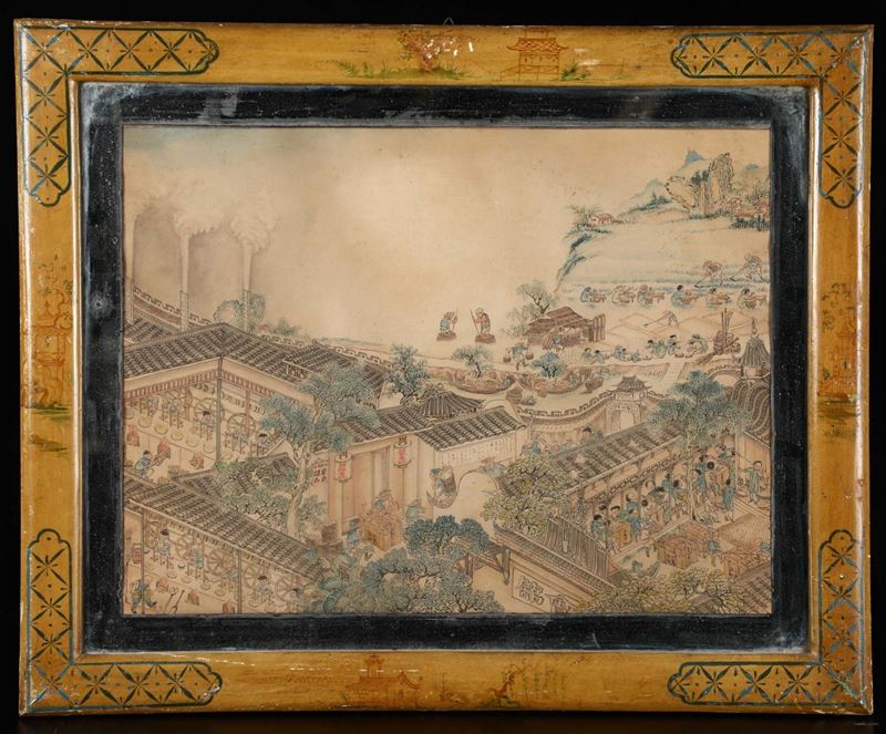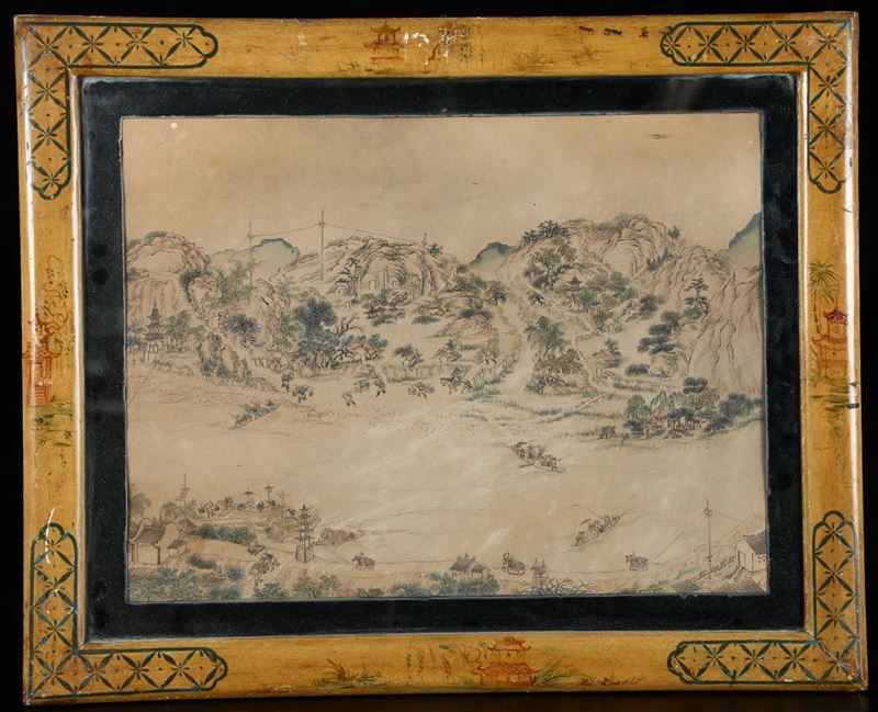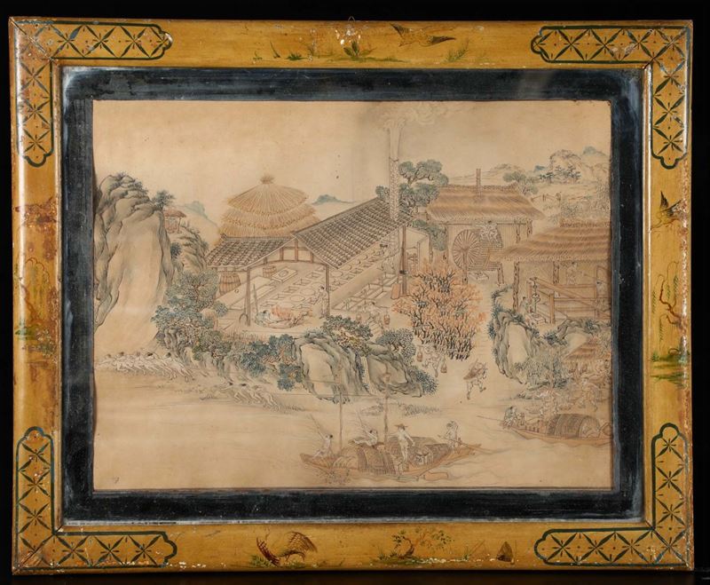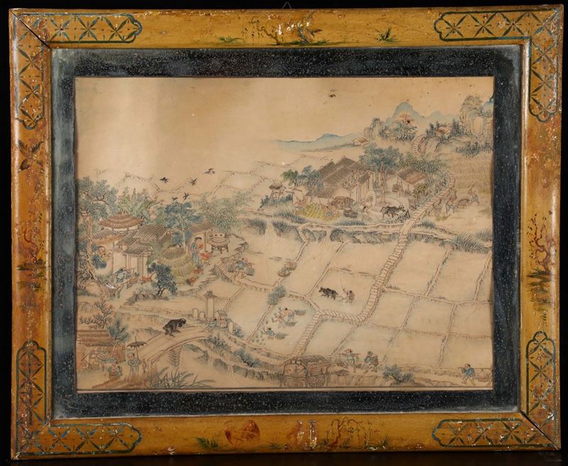 Four framed paintings depicting landscape and common life scenes, Japan, 19th century