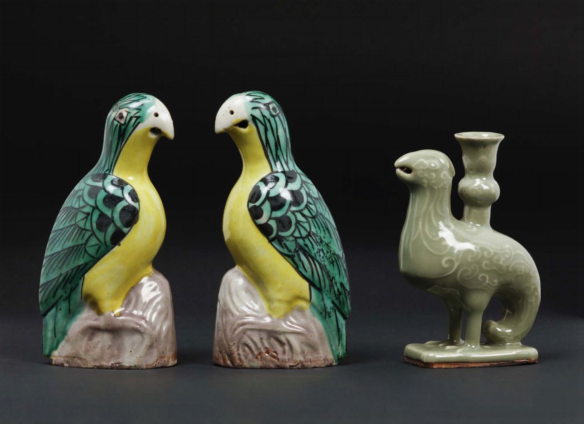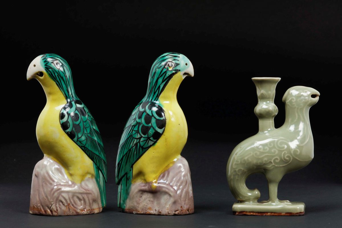 Lot of polychrome and Celadon enammeled porcelain two parrots and a candlestick, China, Qing Dynasty, 18th century