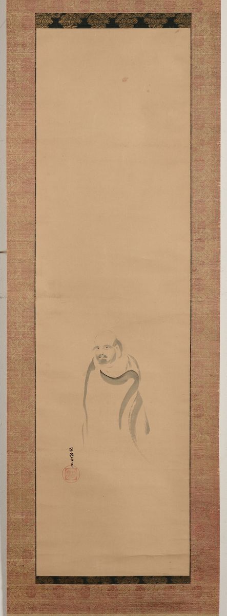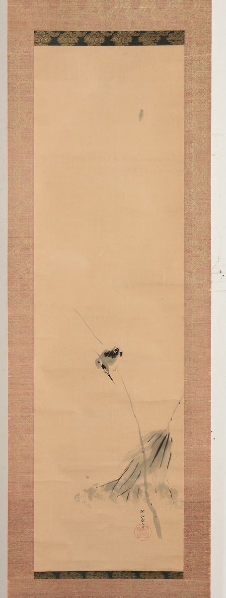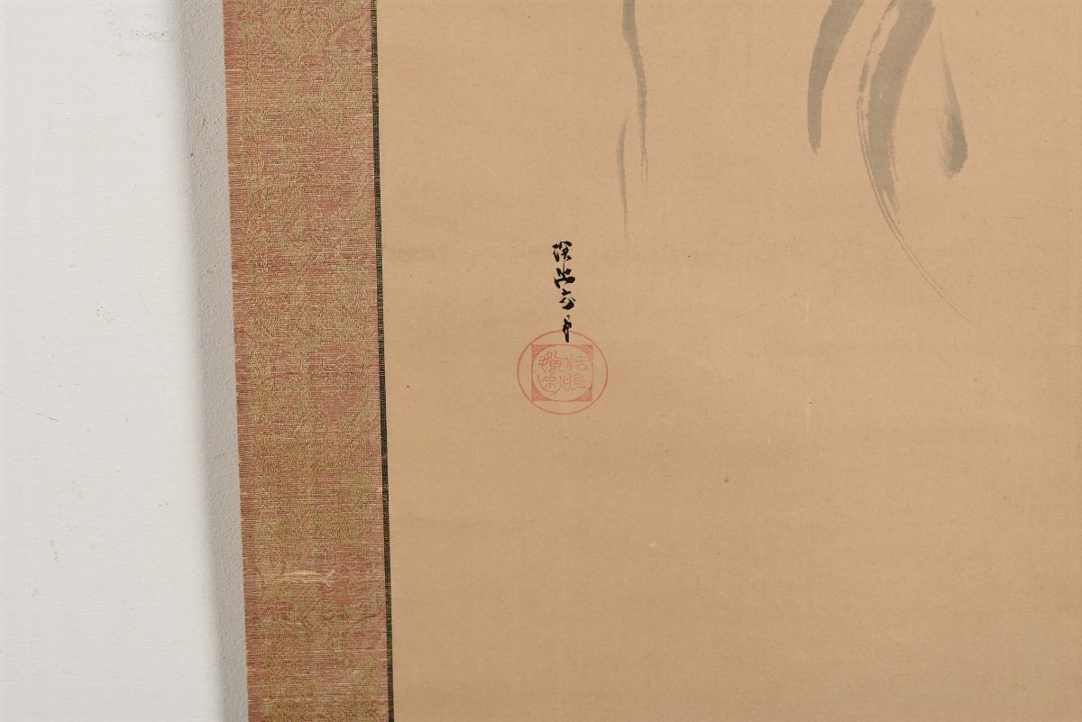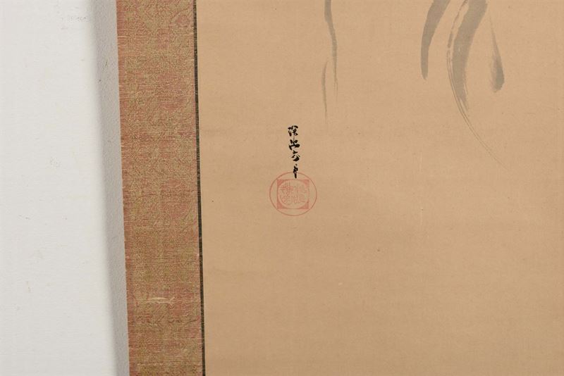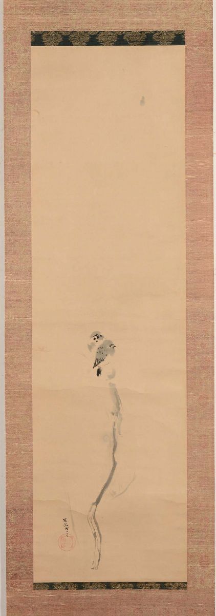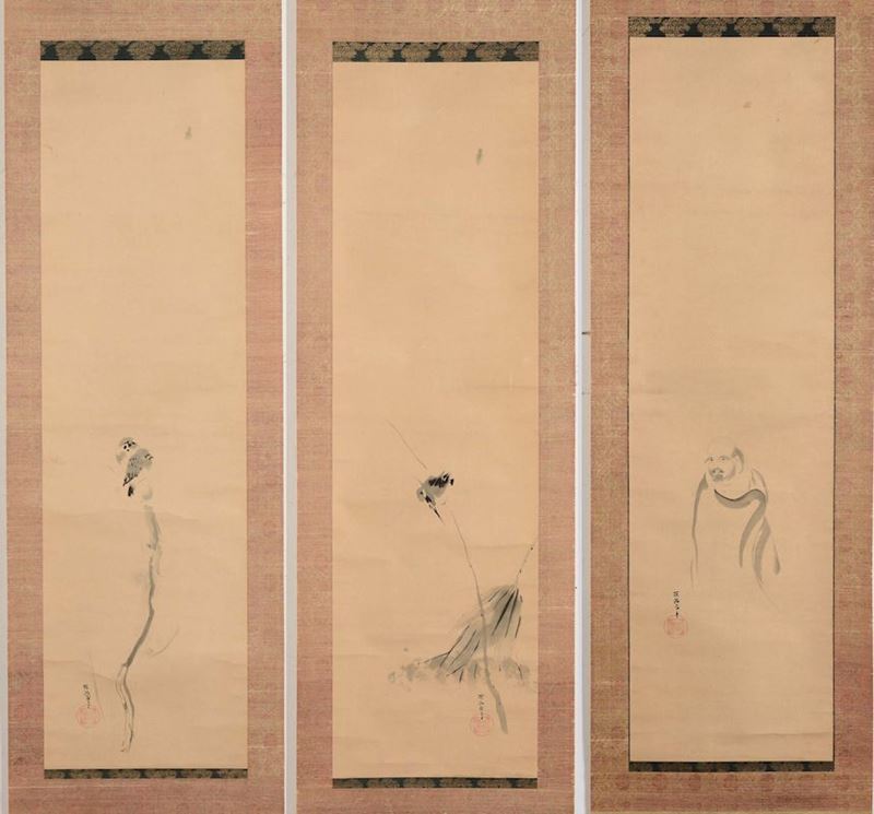 Three paintings on paper depicting wise man and birds with inscription, Japan, 20th century