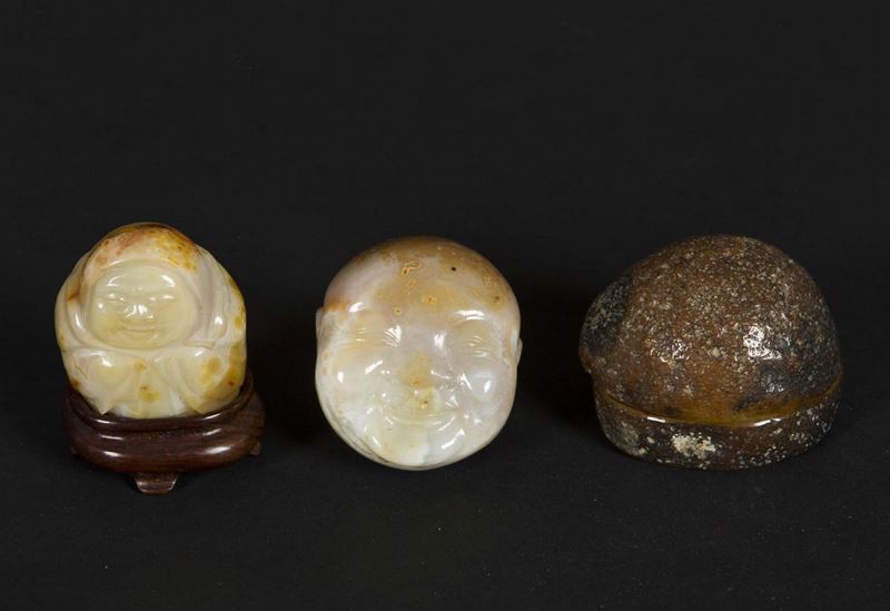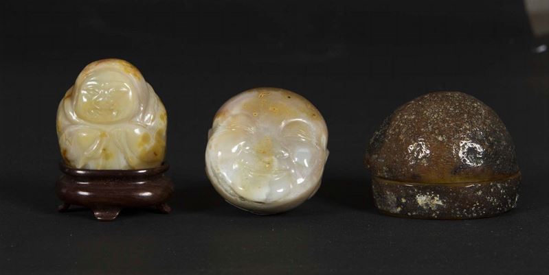 Two carved agate figures and a small box, China, 20th century