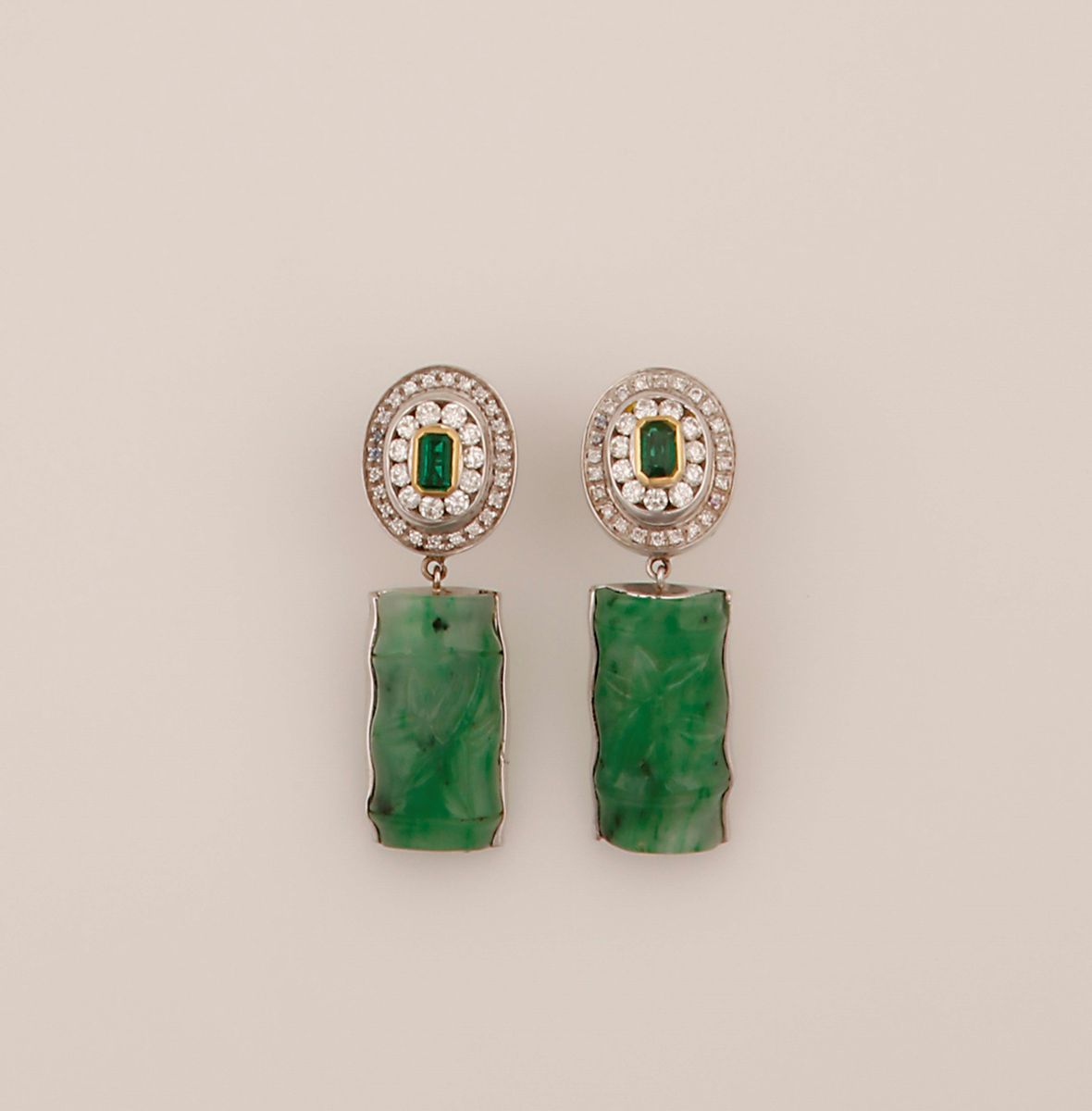 Orecchini pendenti con giadeite incisa, diamanti e smeraldi