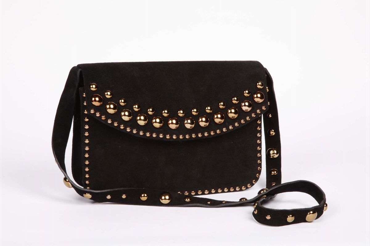 in camoscio nero e borchie in metallo dorato, cm 19x29