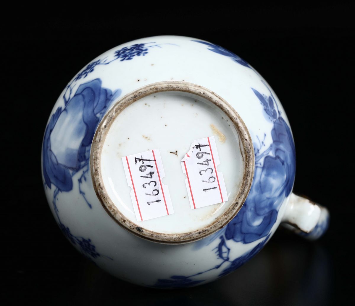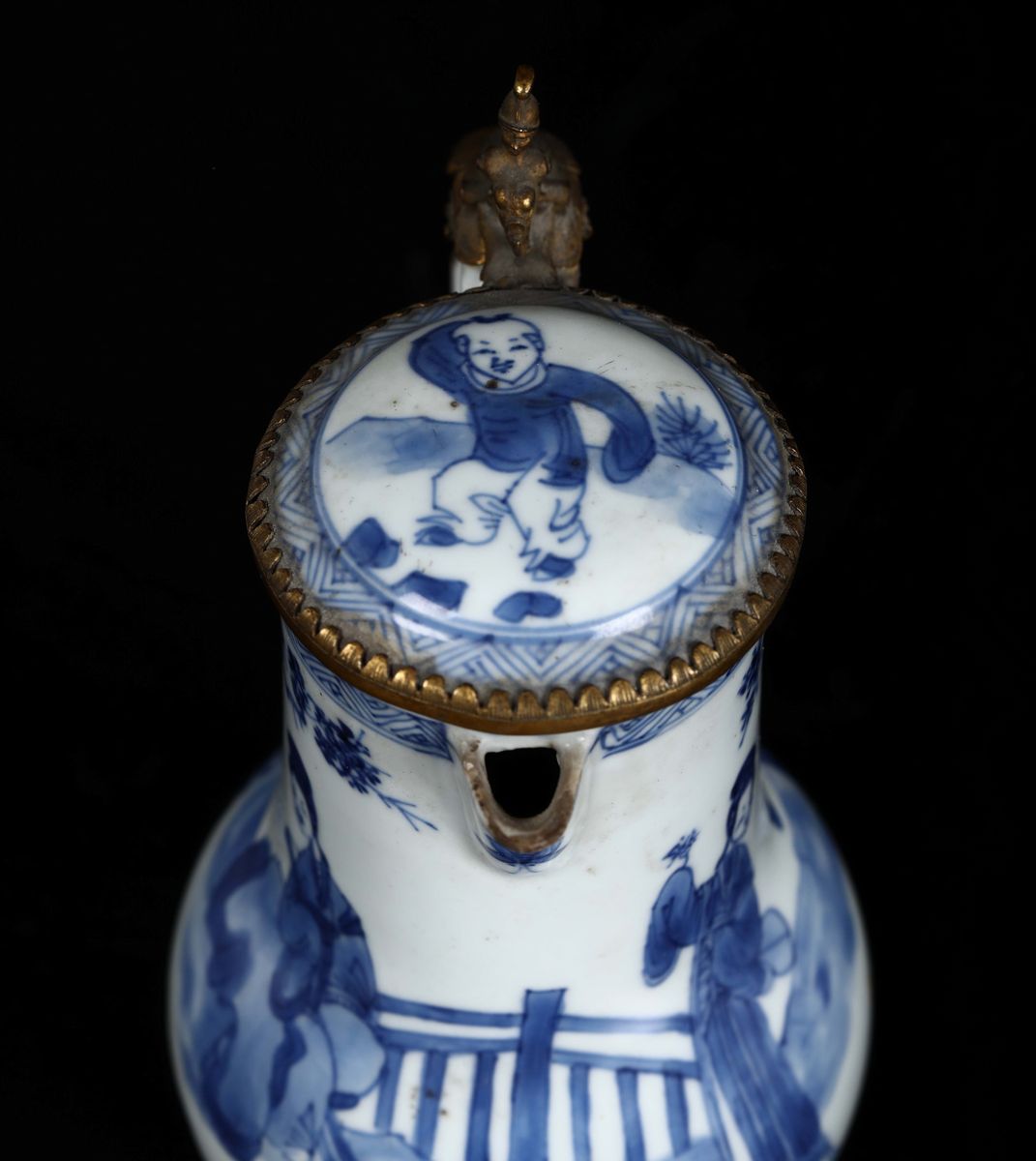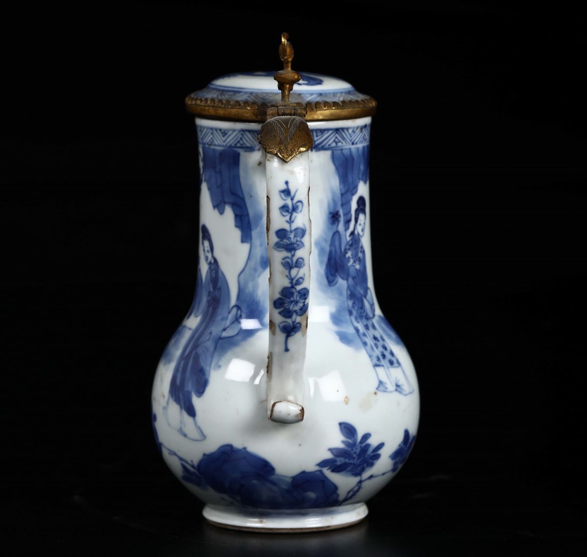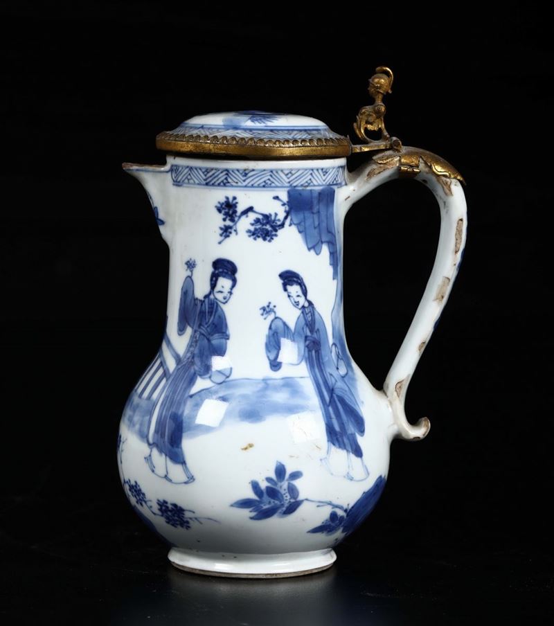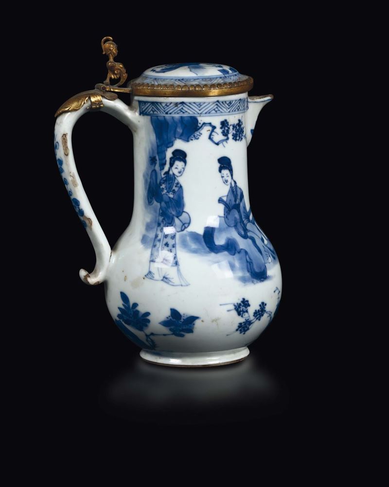 A blue and white coffeepot with Guanyin and gilt bronze details, China, Qing Dynasty, 18th century