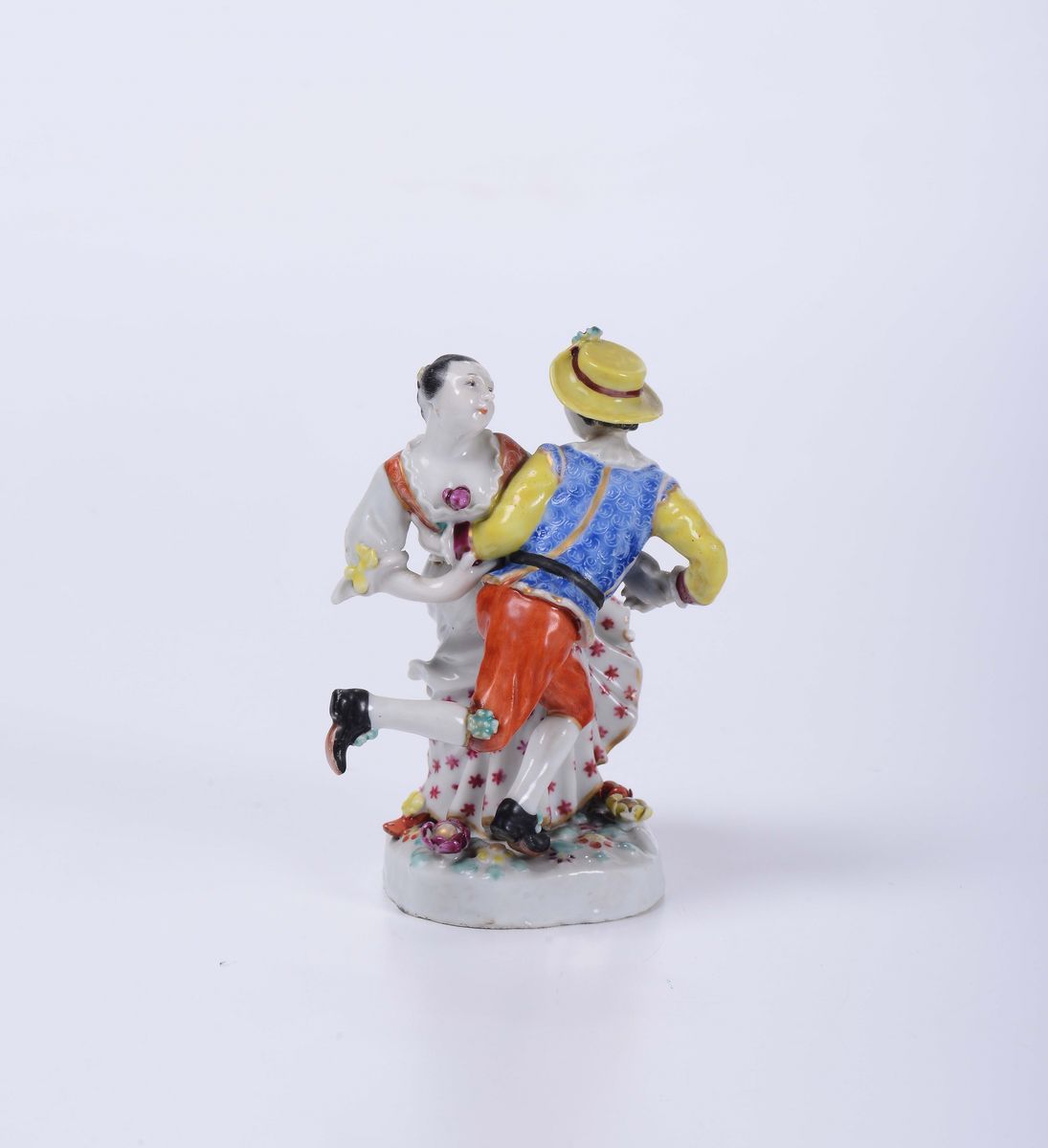 Porcellana. Altezza cm 15 Una testa incollata, una gamba, parte del grembiule e parte del cappello restaurati.Rappresenta due contadini su zolla erbosa mentre danzano la polka. Si tratta di un modello eseguito in Cina per il mercato europeo che venne copiato da un gruppo di Eberlein realizzata a Meissen attorno al 1735