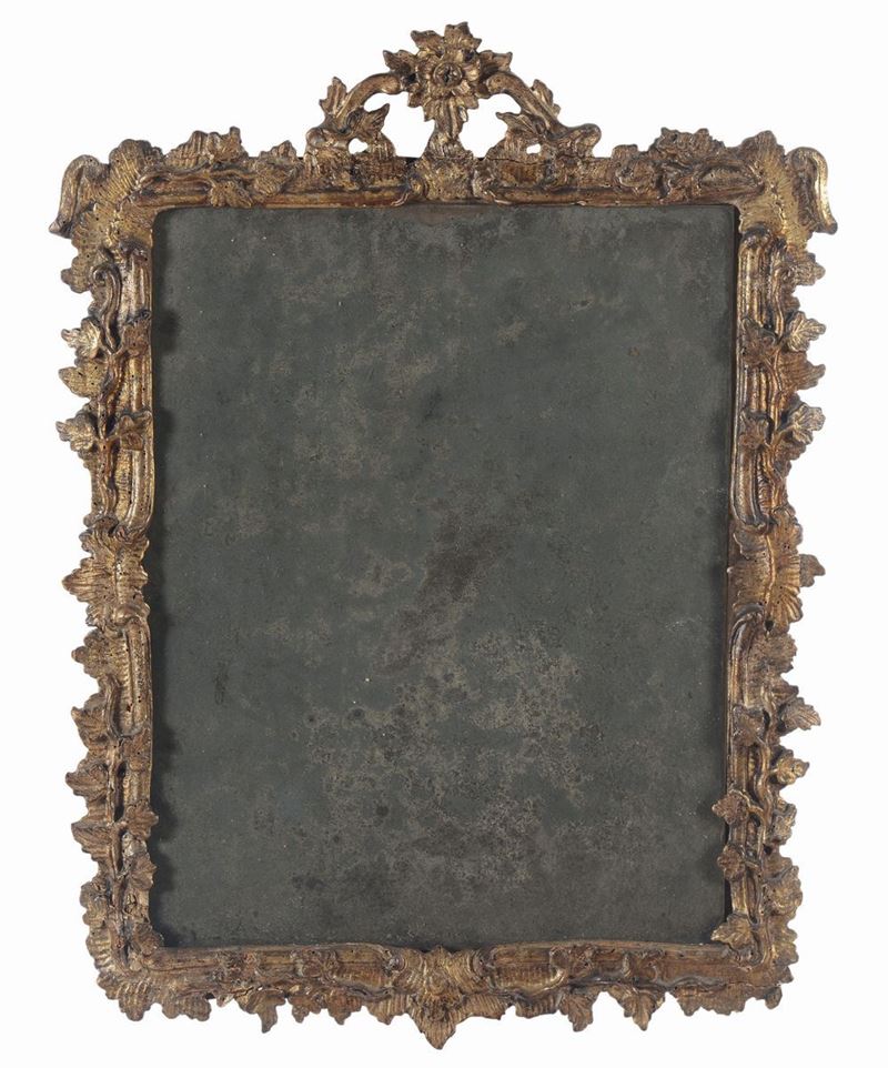 Coppia di specchierine Luigi XV in legno intagliato e dorato a mecca, XVIII secolo