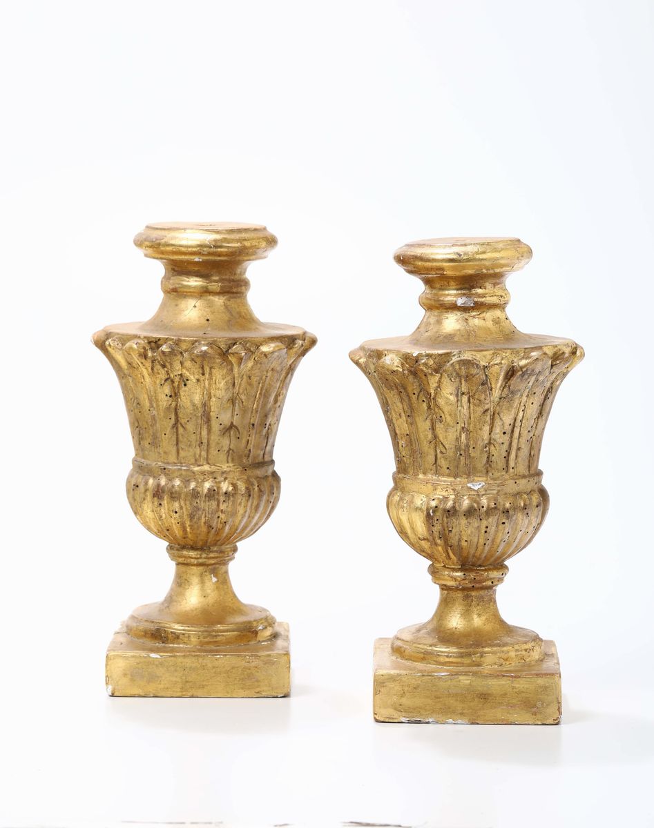 Coppia di vasi porta palme in legno intagliato e dorato, XIX secolo