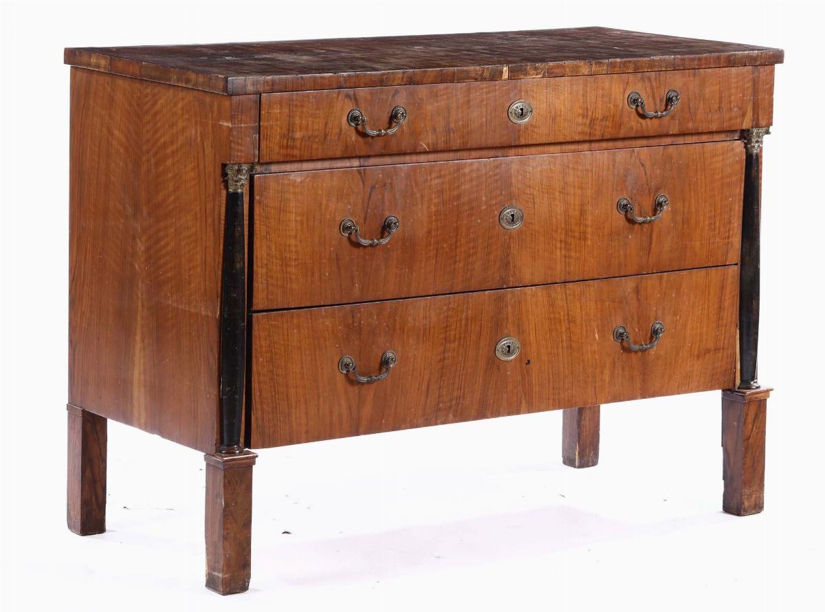 Due comò Impero a tre cassetti in legno lastronato, XIX secolo