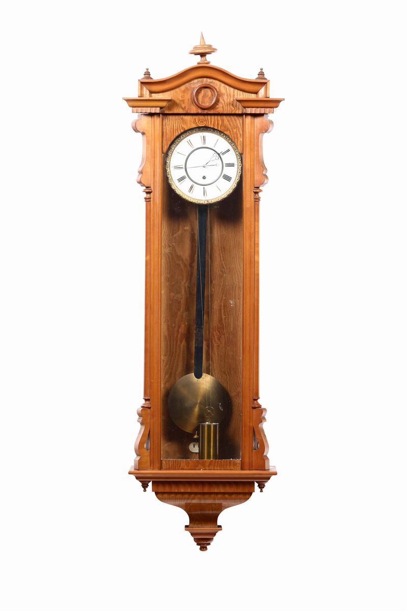 Cassa in legno, quadrante smaltato a numerazione romana in nero per le ore.40 gg di carica.Cm 125x35,5x15 (mancante dei vetri laterali)
