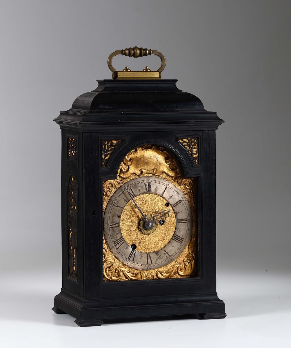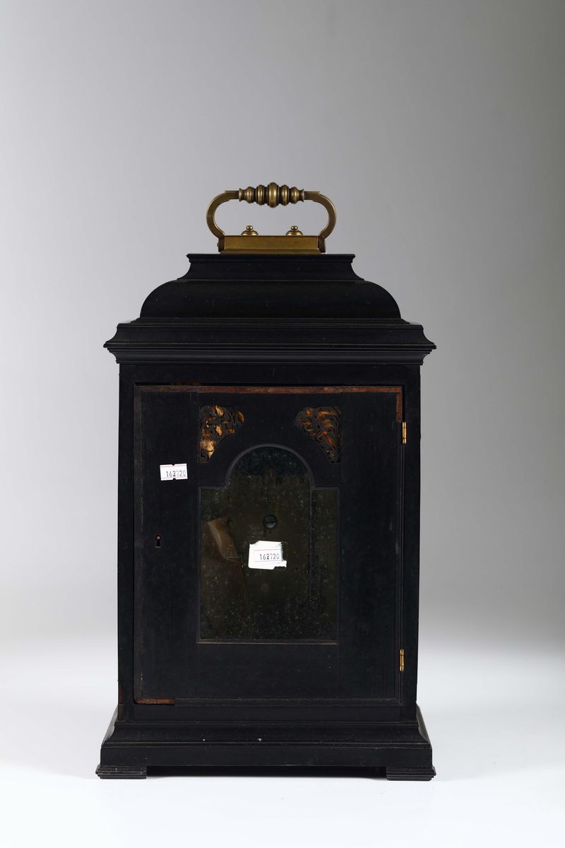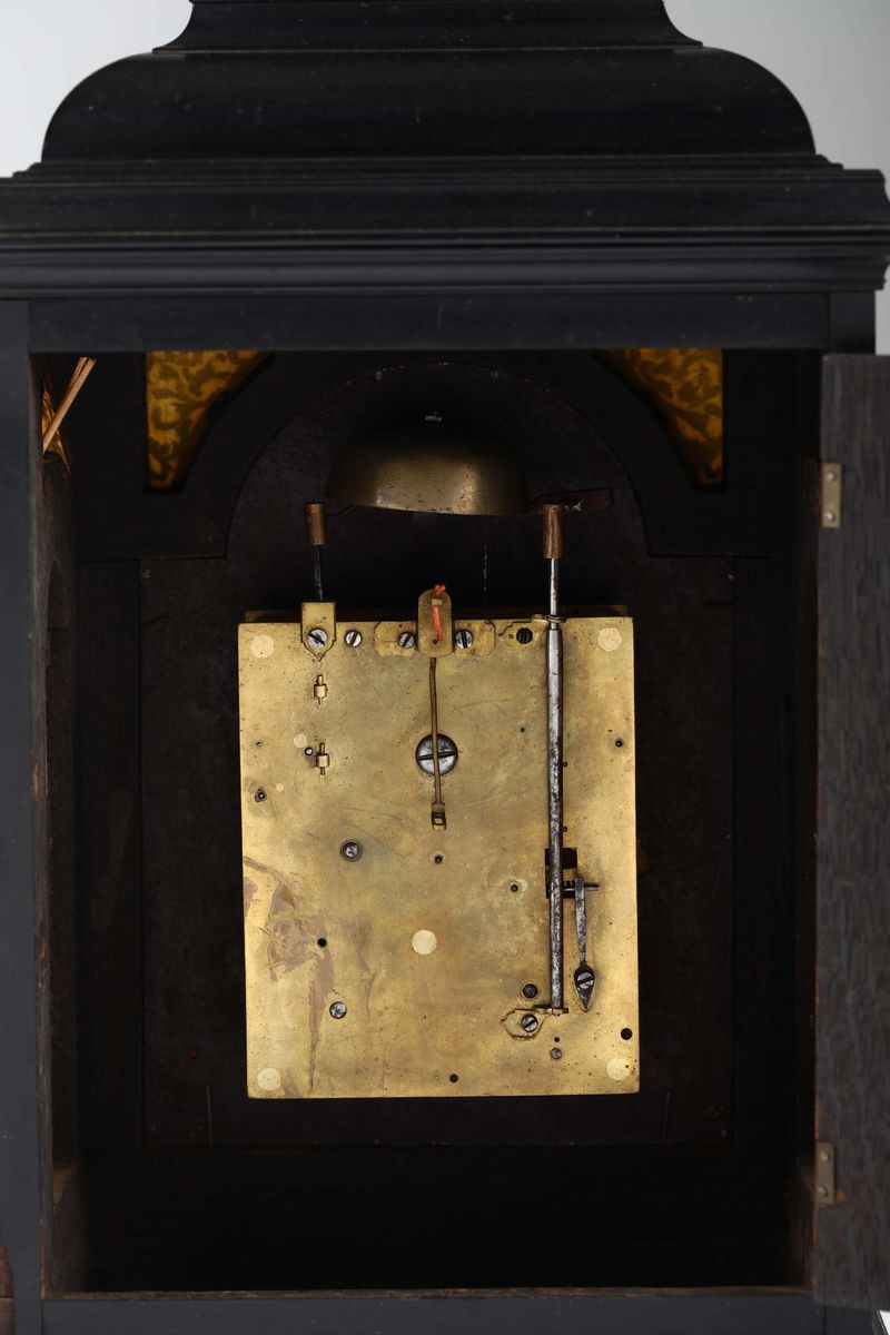 Cassa in pero tinto color ebano. Quadrante in ottone dorato su mostra centinata con applicazioni sbalzate, fascia oraria circolare con numerazione romana. Movimento rettangolare in ottone, scappamento a verga con conoide a budello, suoneria ore e mezze, sveglia.Cm 27x18x50