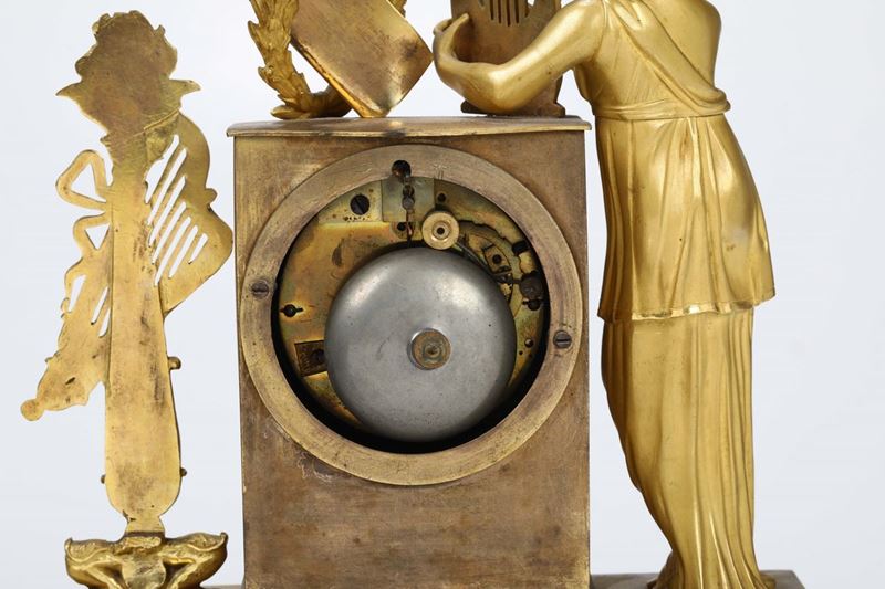 con raffigurazione della Musa Erato patrona del canto corale e della poesia amorosa. Quadrante in bronzo dorato a numerazione romana per le ore. Movimento Parigi sviluppato su due treni di ruote; scappamento ad ancora, suoneria a battuta su campana a passaggio ore e mezze, cm 25x10x38