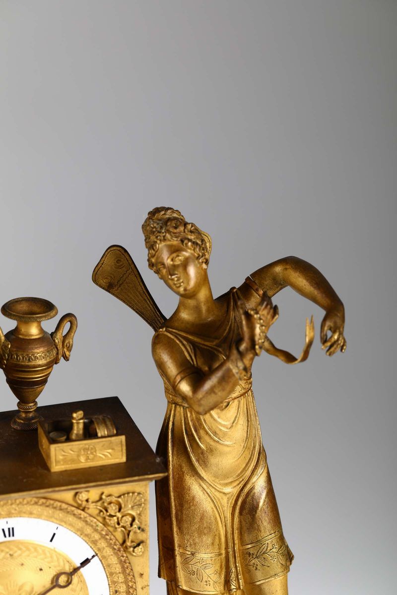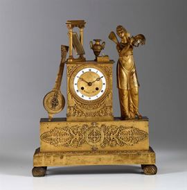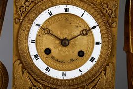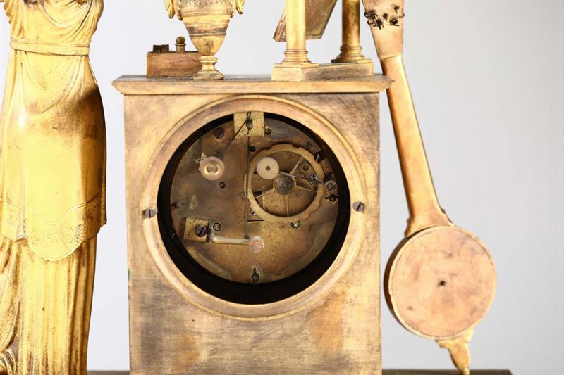 Cassa con figura di psiche a tuttotondo a fianco del quadrante con fascia oraria circolare in smalto bianco con numerazione romana per le ore.Meccanica con sospensione a filo e scappamento ad ancora, suoneria a ore e mezze al passaggio.Cm 32x12x40