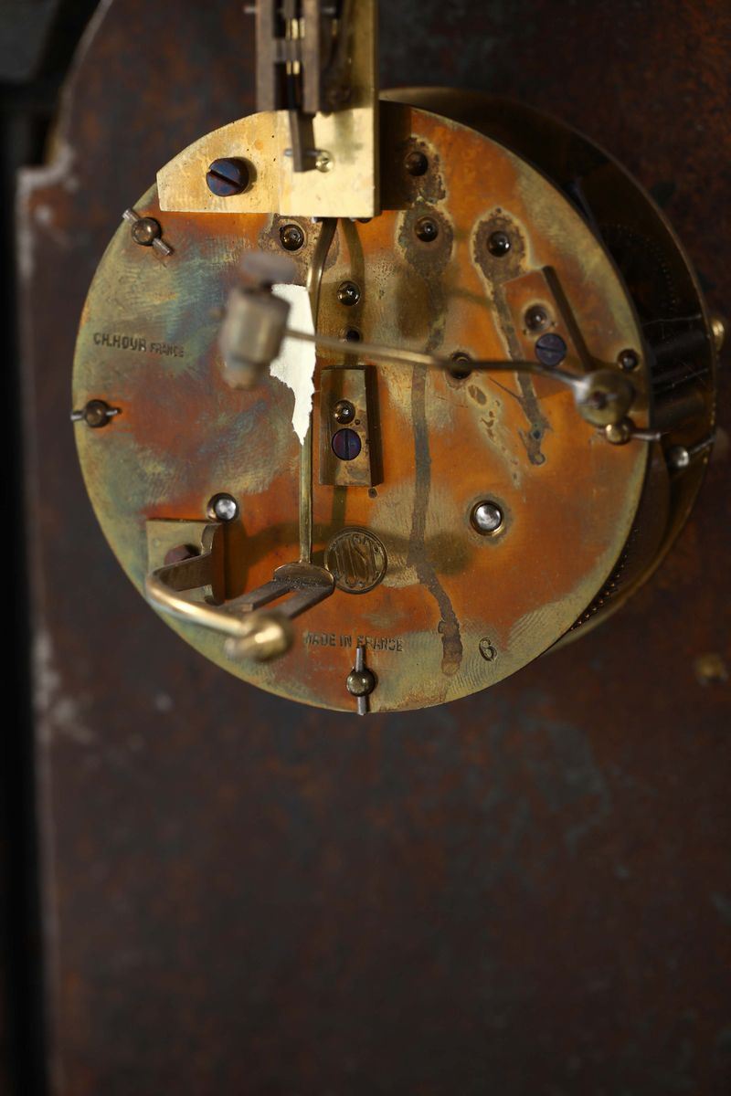 Cassa in legno ebanizzato poggiante su piedini di rapace in bronzo dorato. Quadrante in ottone dorato con numerazione romana per le ore e araba per i minuti.Meccanica non pertinente con sospensione a lamella e scappamento ad ancora, suoneria a ore e mezze su rastrello al passaggio.cm 27x14x37