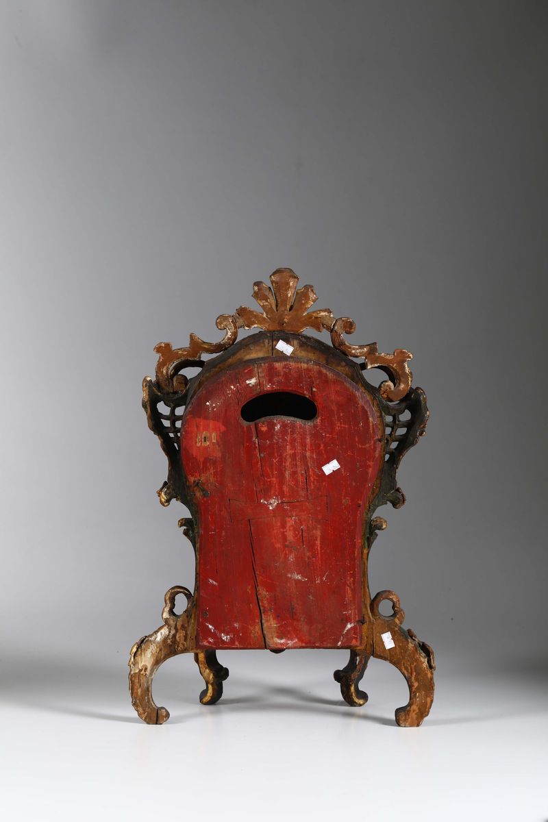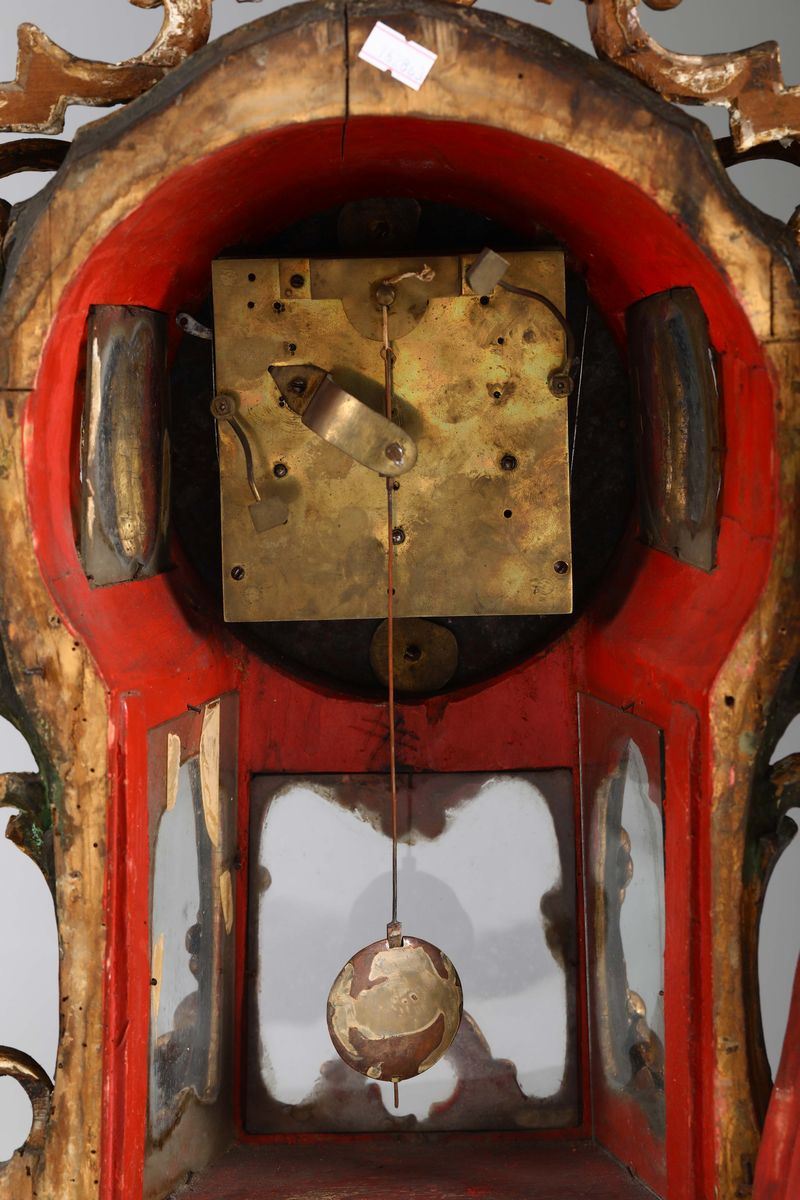 Cassa sagomata in legno intagliato, dipinto e dorato a decori di volute ed elementi floreali. Quadrante in smalto bianco a numerazione romana per le ore e araba per i minuti.Meccanica non pertinente con scappamento ad ancora e suoneria a ore e quarti. Cm 40x15x60