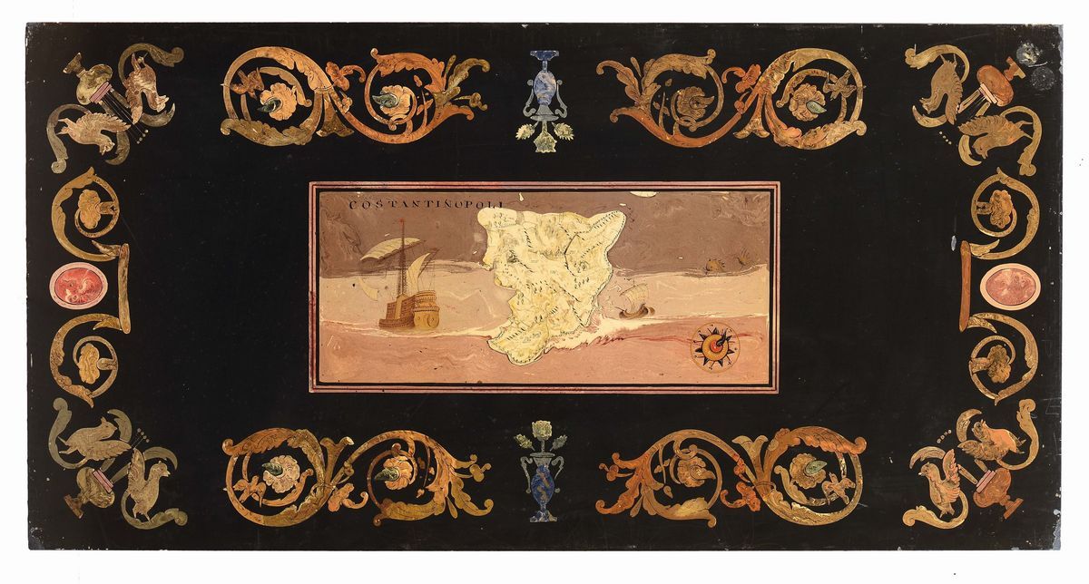 con raffigurazione centrale di mappa e veliero e scritta Costantinopoli e bordo decorata a volute fogliacee, cm 100x50