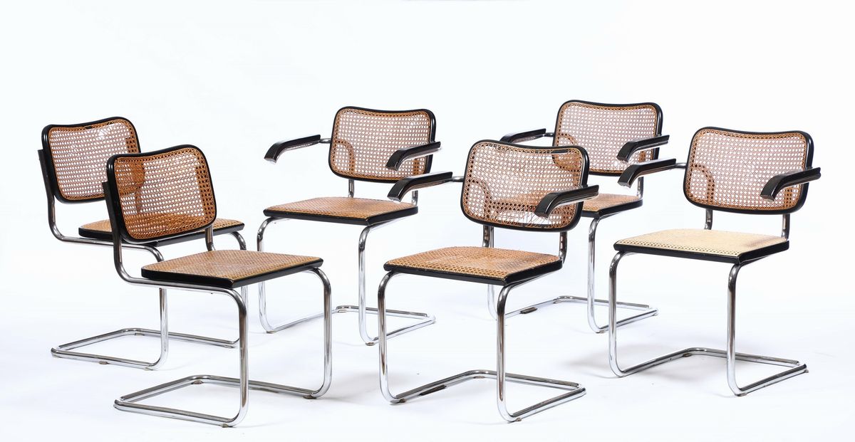 Quattro sedie e due poltrone serie Cesca per Gavina, design Marcel Breuer