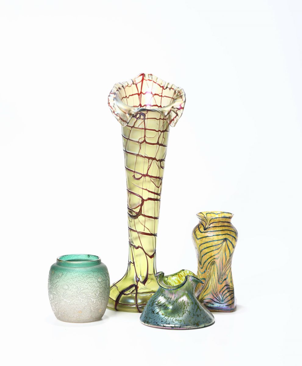Quattro vasi in vetro diversi tipo Loetz, XX secolo