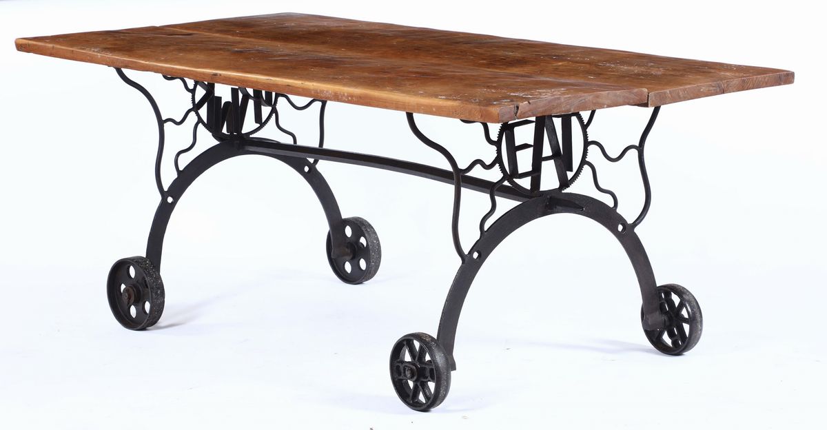 Tavolo con piano in legno e gambe in ferro dipinto, XX secolo