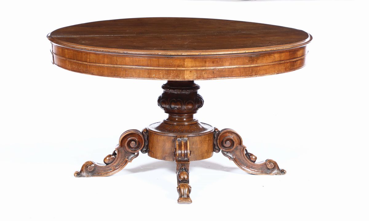 Tavolo rotondo da pranzo Luigi Filippo allungabile, in noce con gamba centrale intagliata, XIX secolo