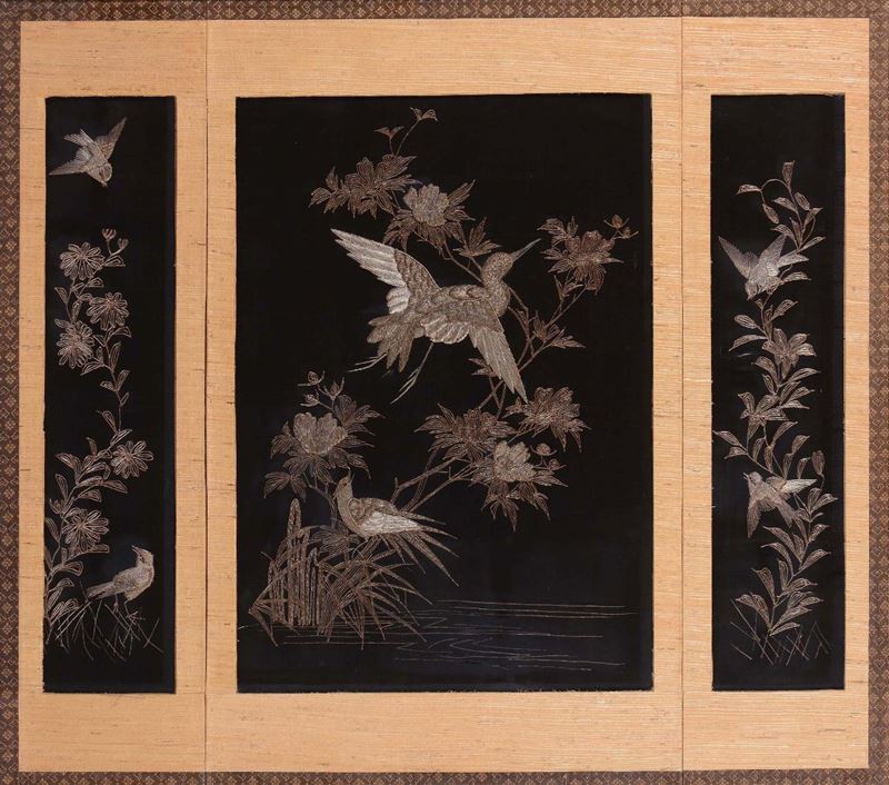 Two black-ground framed silk cloth with birds and flowers, Japan, 19th century