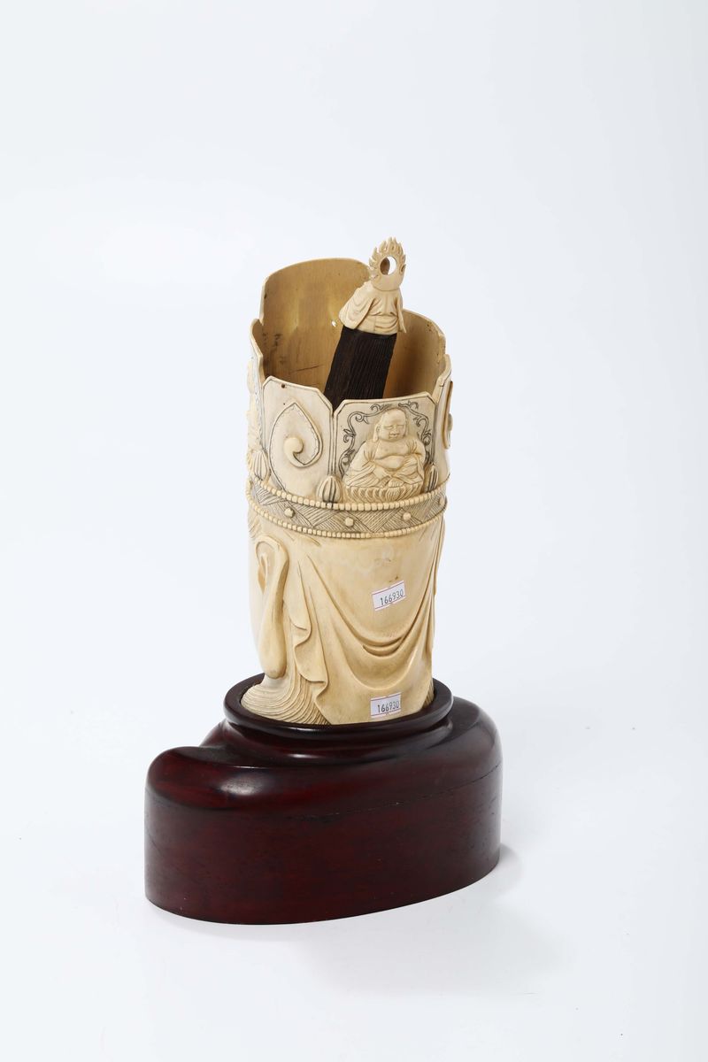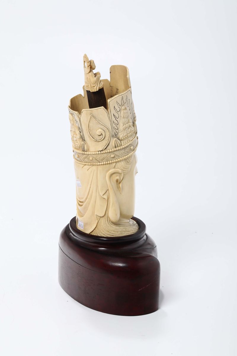 Zanna in avorio scolpita raffigurante divinità orientale su base in legno