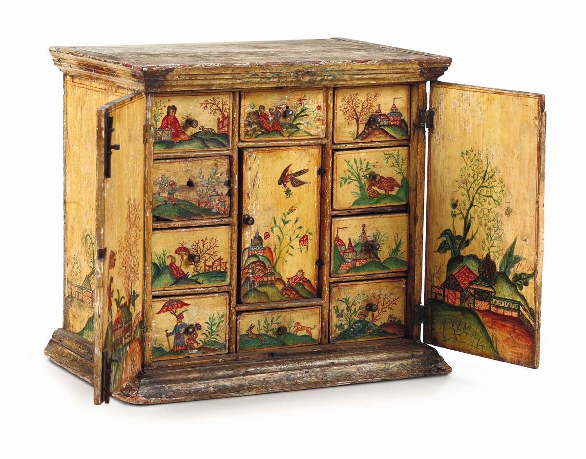 interno con cassettini ed antina centrale, decori policromi raffiguranti personaggi, paesaggi e volatiliDimensioni: 39x25x36,5 cm