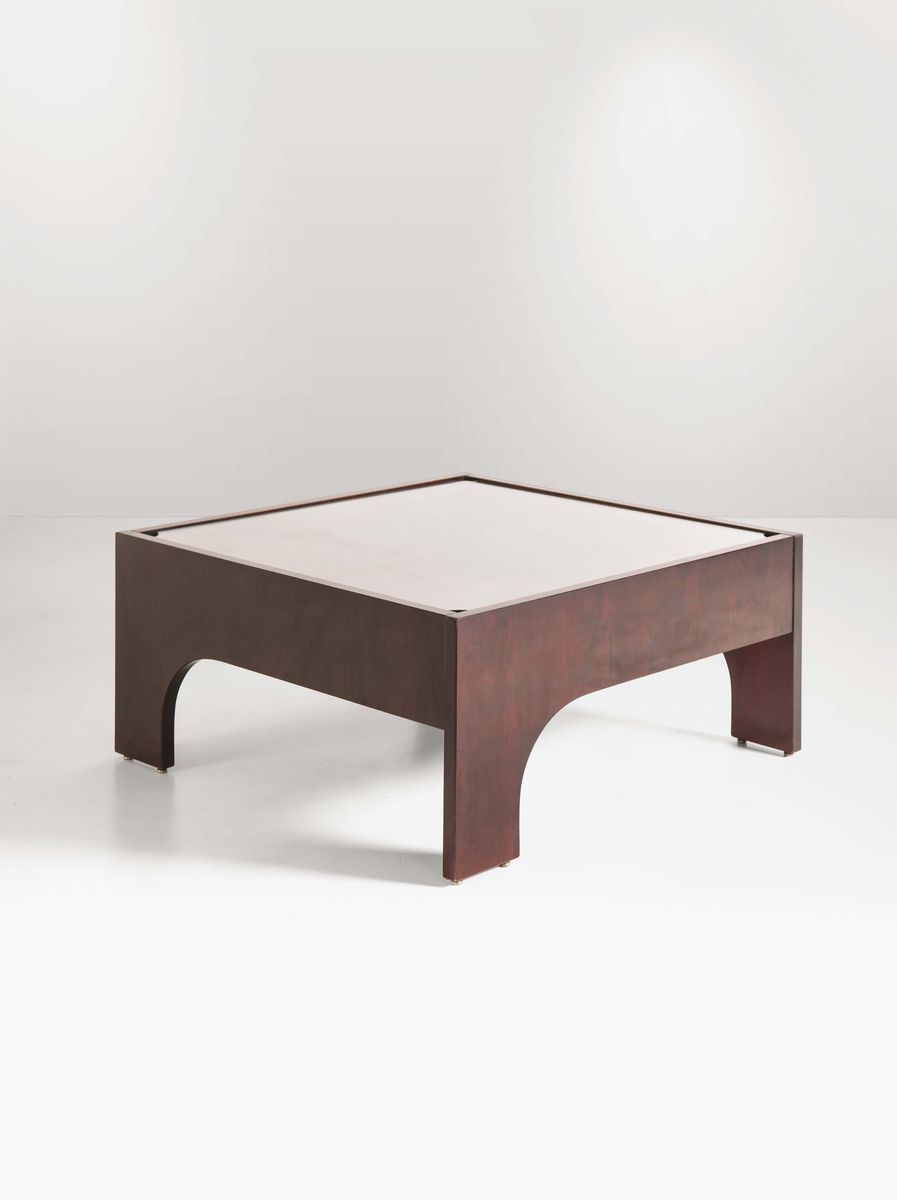 Tavolo basso in legno con piano in vetro e dettagli in metallo. Prod. Italia, 1960 ca. cm 83x42x83