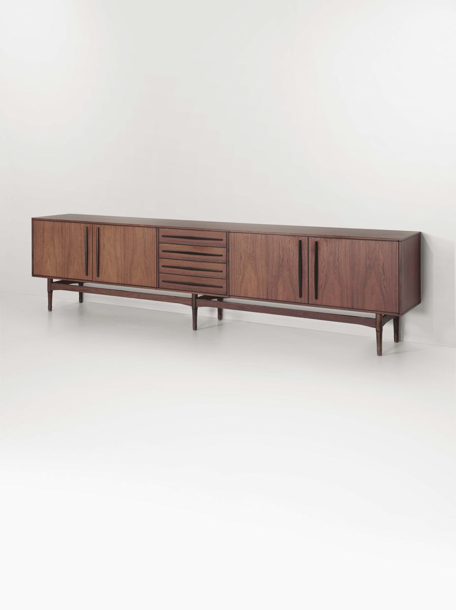 Credenza da parete in legno con dettagli in metallo.