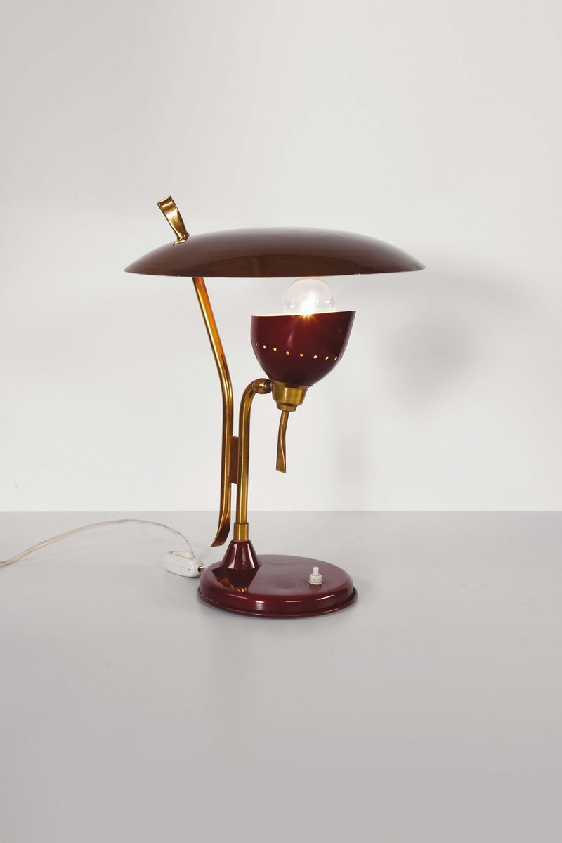 Lampada da tavolo con struttura in ottone, base e riflettori in metallo laccato.Prod. Lumen, Italia, 1950 ca. cm 33x40