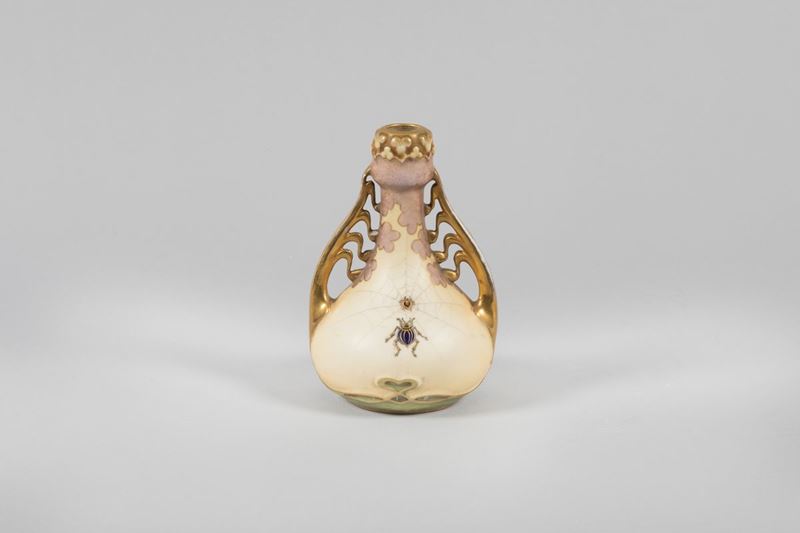 Piccolo vaso con anse in terraglia con decoro di insetti in smalto e dorature.