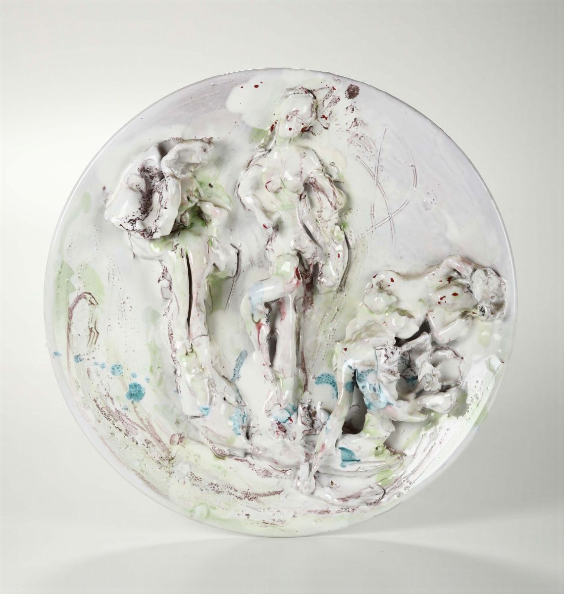 Antonio Sabatelli, Albisola, 1960 ca. A large maiolica plate with a decor of female figures in high-relief, slight polychromy under the varnish