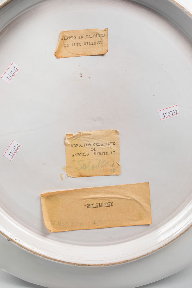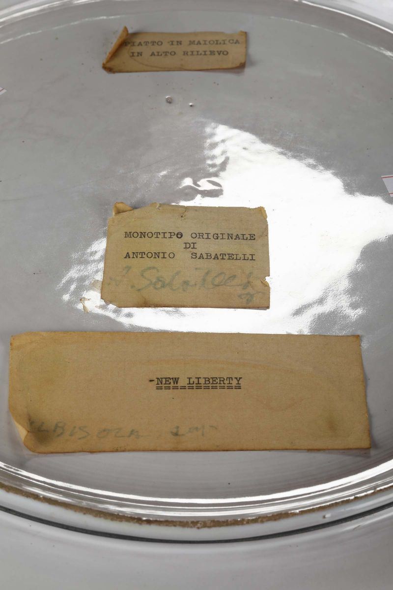 Antonio Sabatelli, Albisola, 1960 ca. A large maiolica plate with a decor of female figures in high-relief, slight polychromy [..]