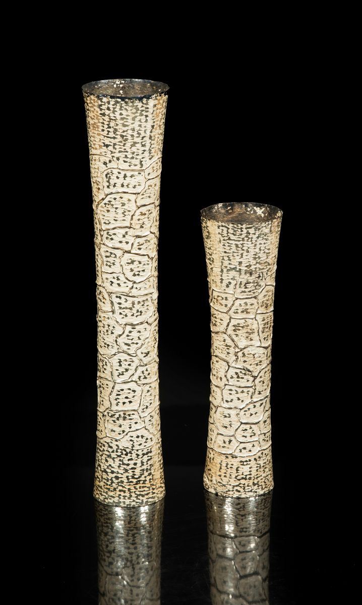 Coppia di vasi in argento martellato con superficie lavorata con gli ossidi.