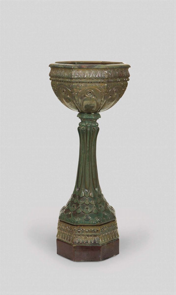Fioriera in terracotta maiolicata a lustri su alto piede con decoro geometrico. Basamento ottagonale poggiante su base in legno.