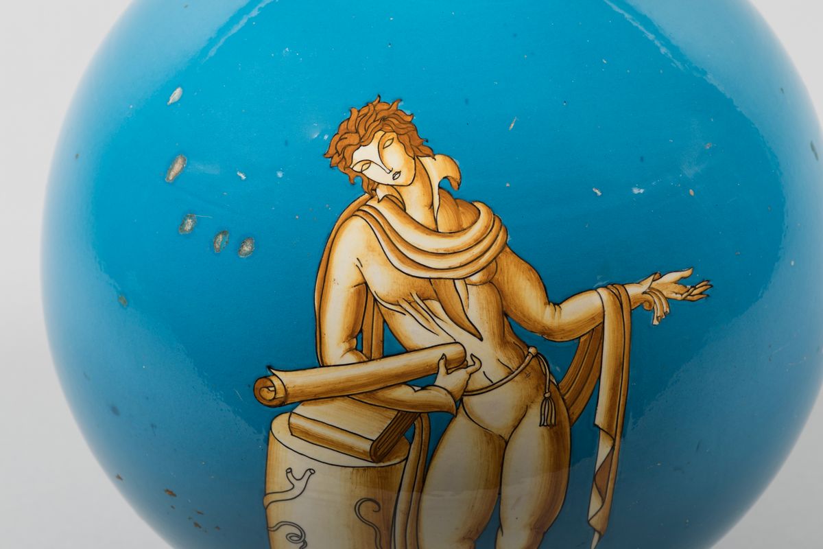 Gio Ponti, Richard Ginori, Sesto Fiorentino, 1930 ca, L'architetto. A large majolica vase with a figure in old-fashioned clothes in monochrome sepia on a turquoise background