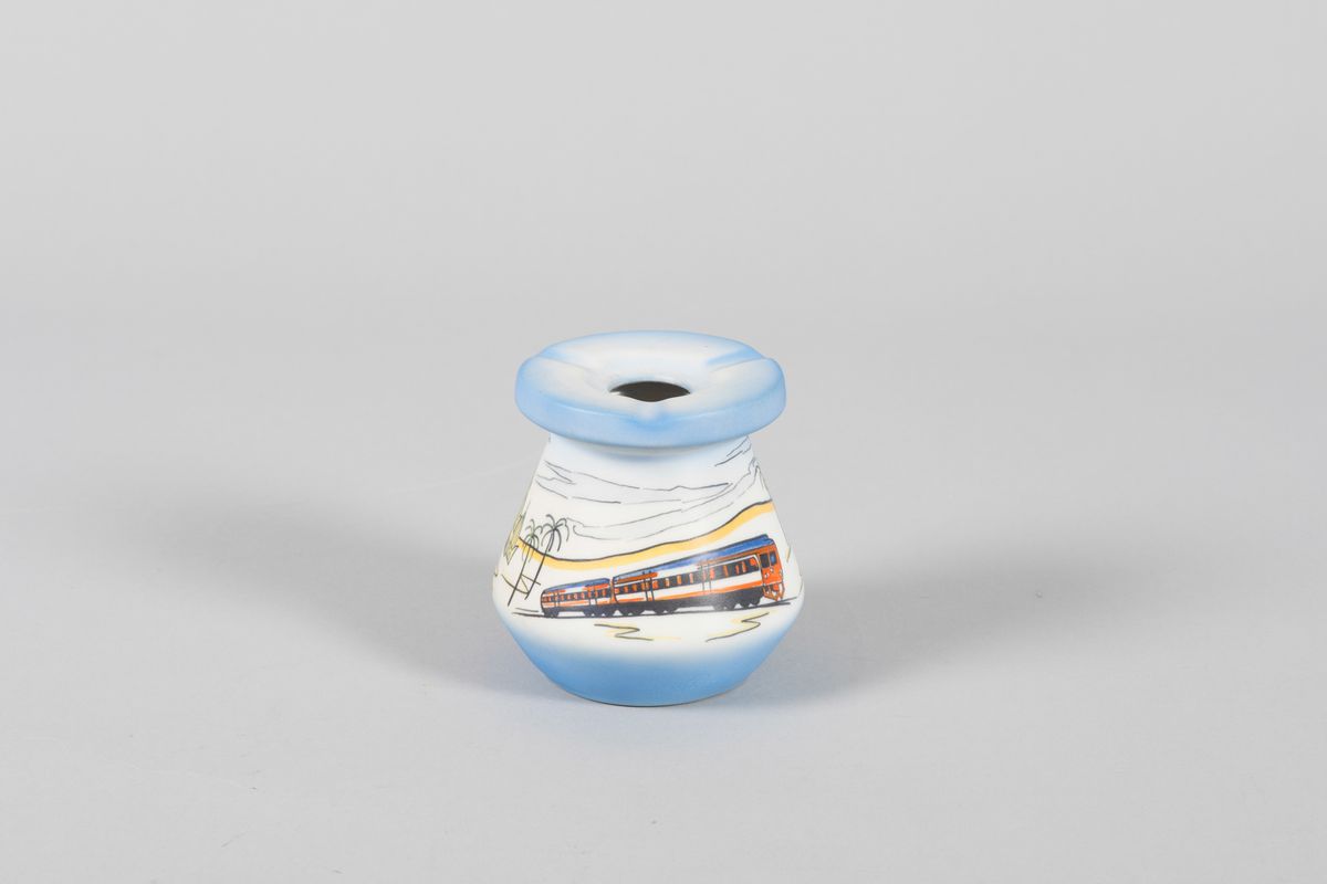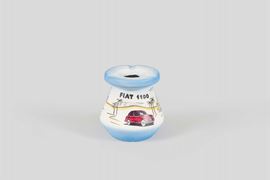 Posacenere pubblicitario Fiat 1100 in terraglia a colaggio decorato in policromia.