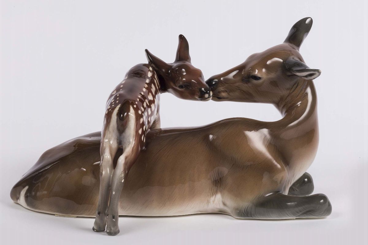 Figura di cerbiatti in terraglia a colaggio con decoro policromo.