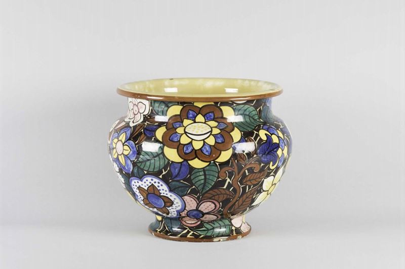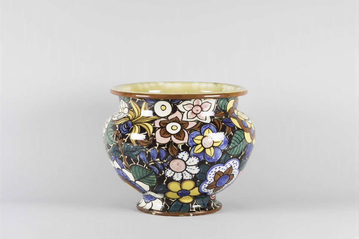 Manlio Trucco, La Fenice, Albisola, 1930 ca. A large cachepot in polychrome tin-glazed terracotta with a decor of stylised flowers
