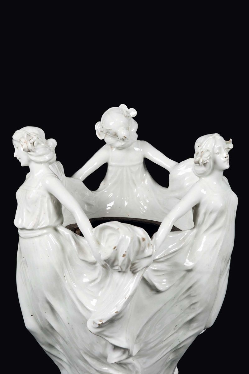 Società Ceramica Richard Ginori, Sesto Fiorentino, 1902 ca. A monumental flower vase in earthenware ceramics depicting three dancers