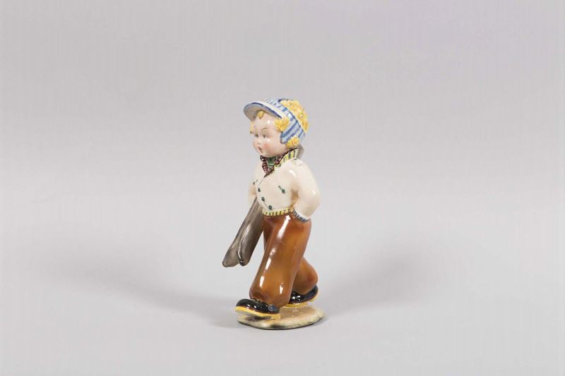 Figura di bambina sciatrice in terracotta con decoro policromo.