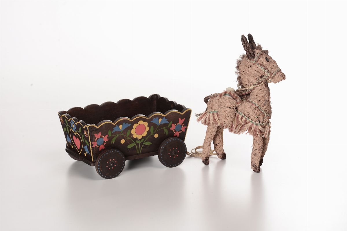 Asino di pezza con carro in legno dipinto, Lenci