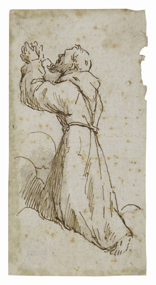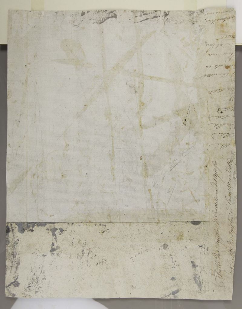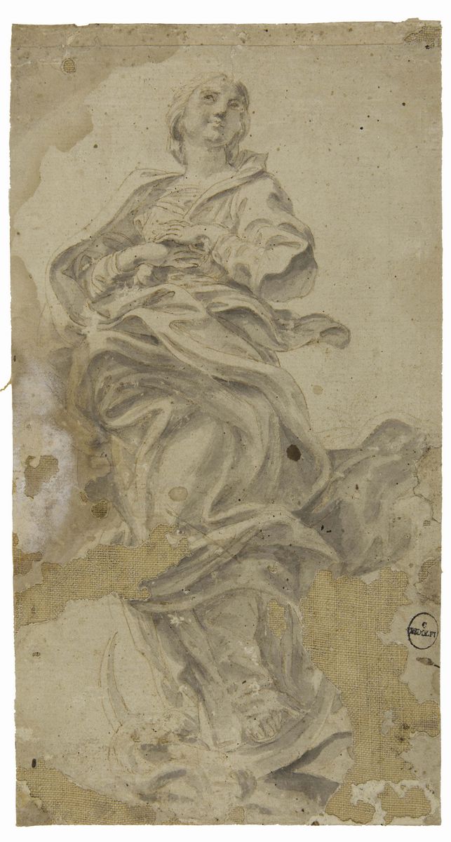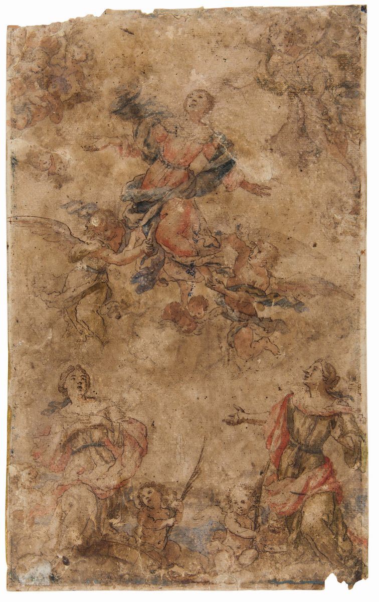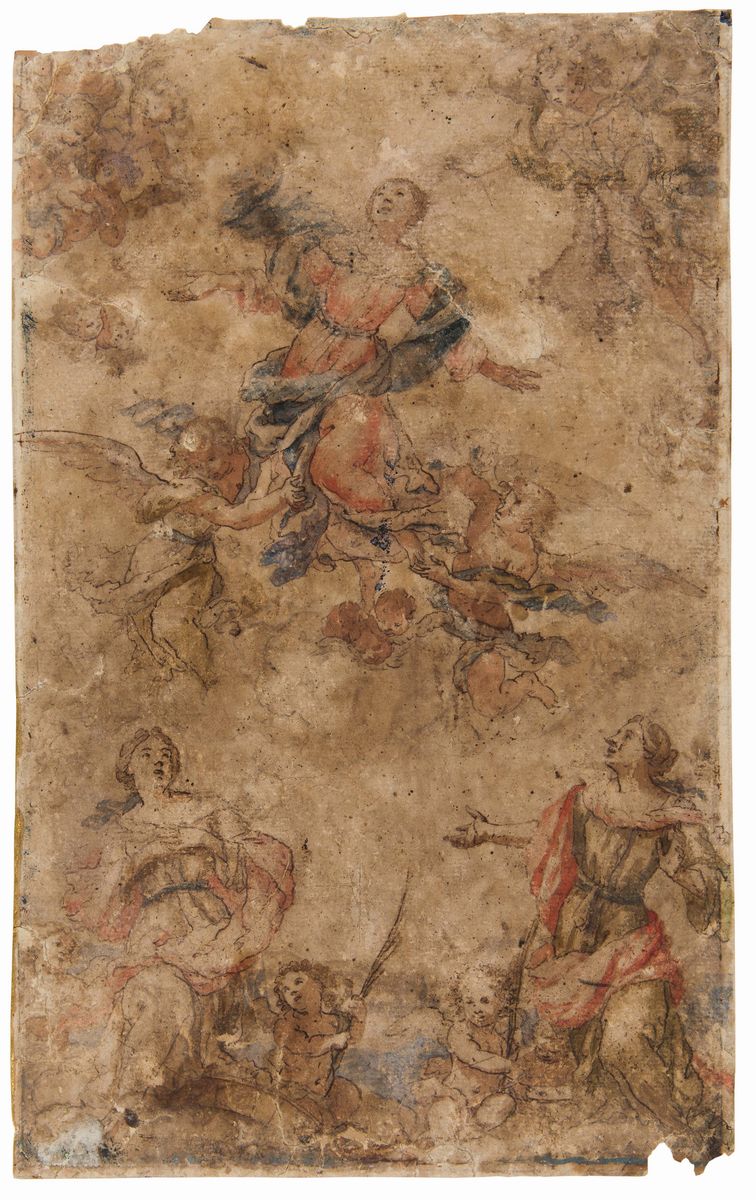 Scuola di Francesco Solimena (1657-1747), Rachele e Giacobbepenna e inchiostro nero su carta preparata, mm 395x310-Scuola genovese del XVII secolo , Immacolata, penna e inchiostro bruno acquerello grigio su carta- Scuola italiana XVIII secolo, Assunzione della Vergine, penna e inchiostro bruno, acquerelli colorati su carta, mm 390x240- Scuola bolognese del XVII secolo, Frate in preghiera , penna e inchiostro bruno su carta, mm 140x750