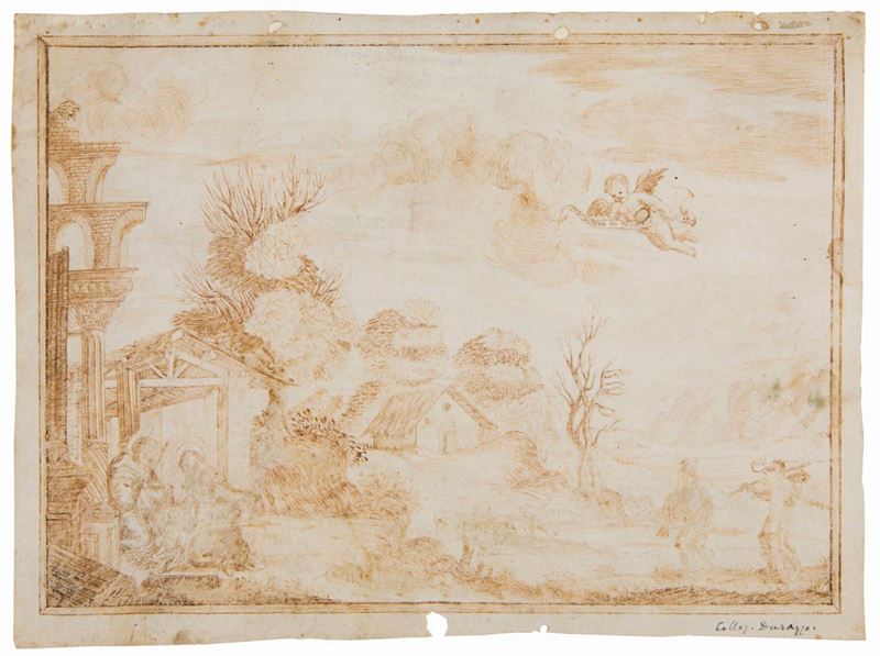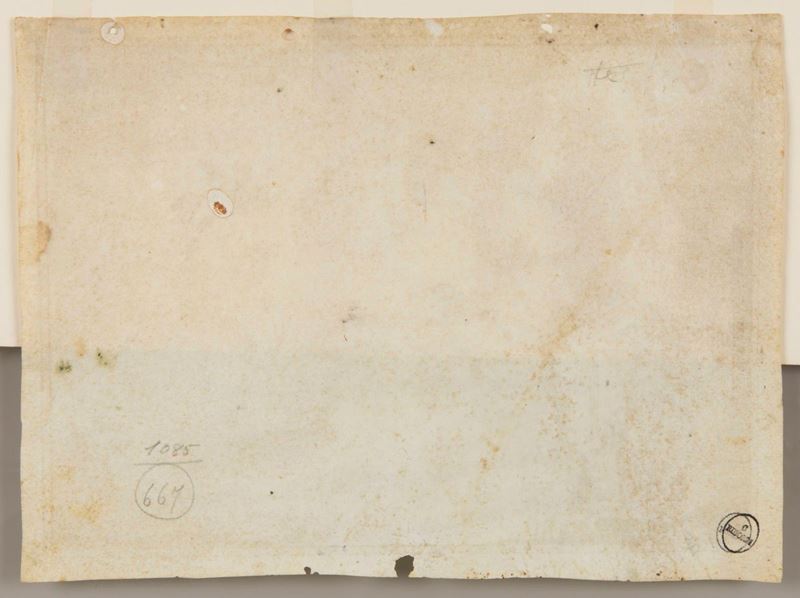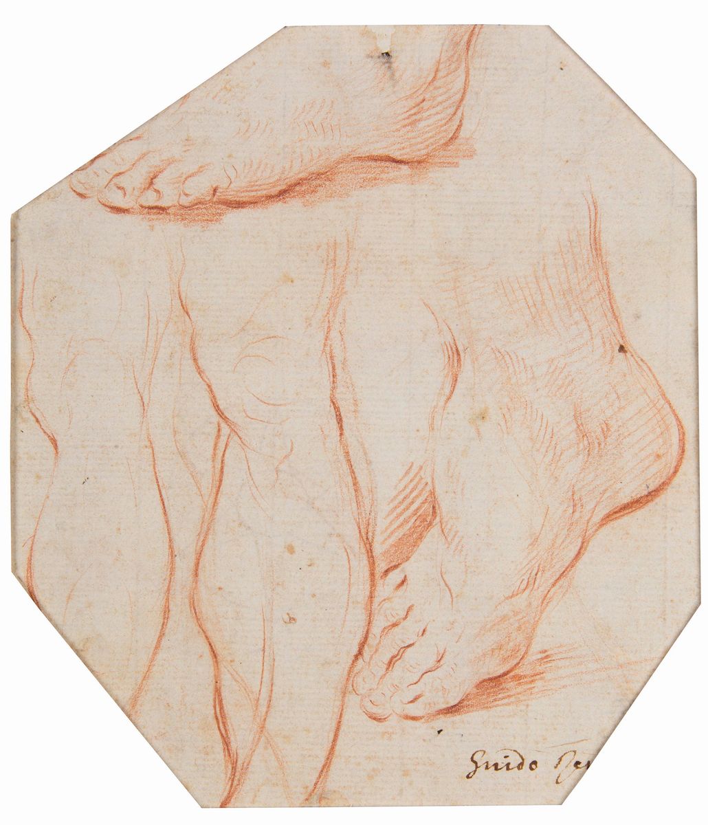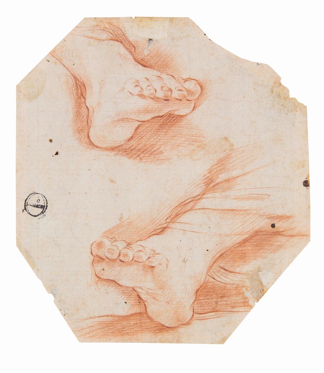 Scuola italiana XVII secolo, Studio di figura femminile, penna inchiostro acquerello brunito su carta, mm 201x158, Scuola italiana della prima metà del XVII secolo, Paesaggio con figure, penna inchiostro brunito su carta, mm232x172 , Guido Reni, Studi di piedi, recto-verso, sanguigna su carta mm 151x167