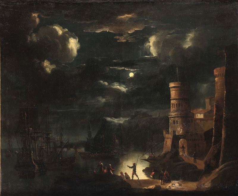 Scuola del XVIII secolo Paesaggio costiero notturno