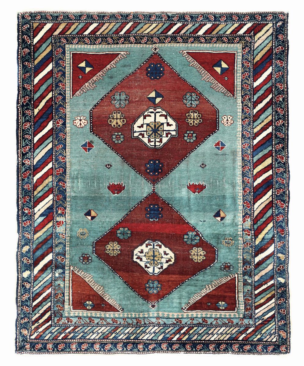 campo verde acqua con due medaglioni, con due medaglioni tabacco, bordura a linee diagonali colorate, cm 138x113