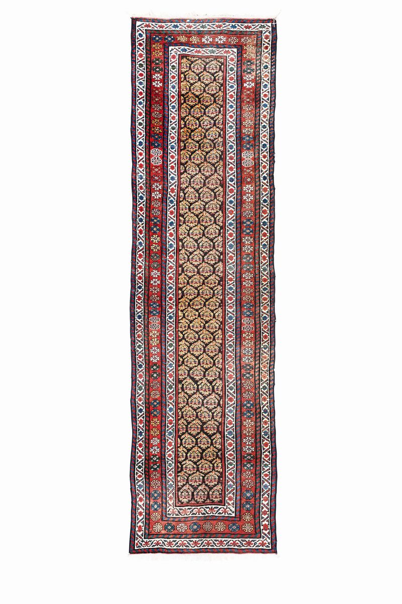 campo marrone a file orizzontali alternate di bothe gialle, bordura principale rossa cm 326x86
