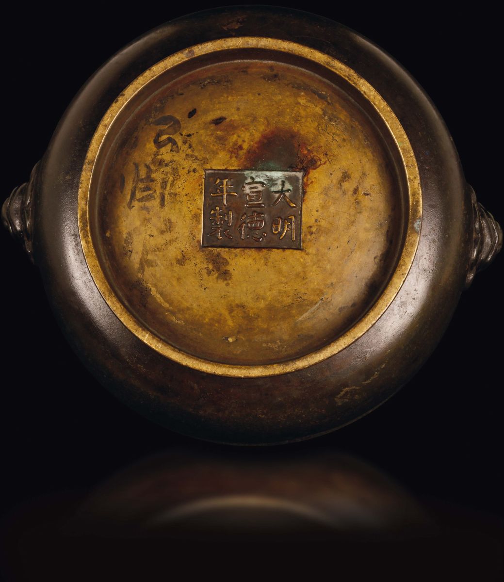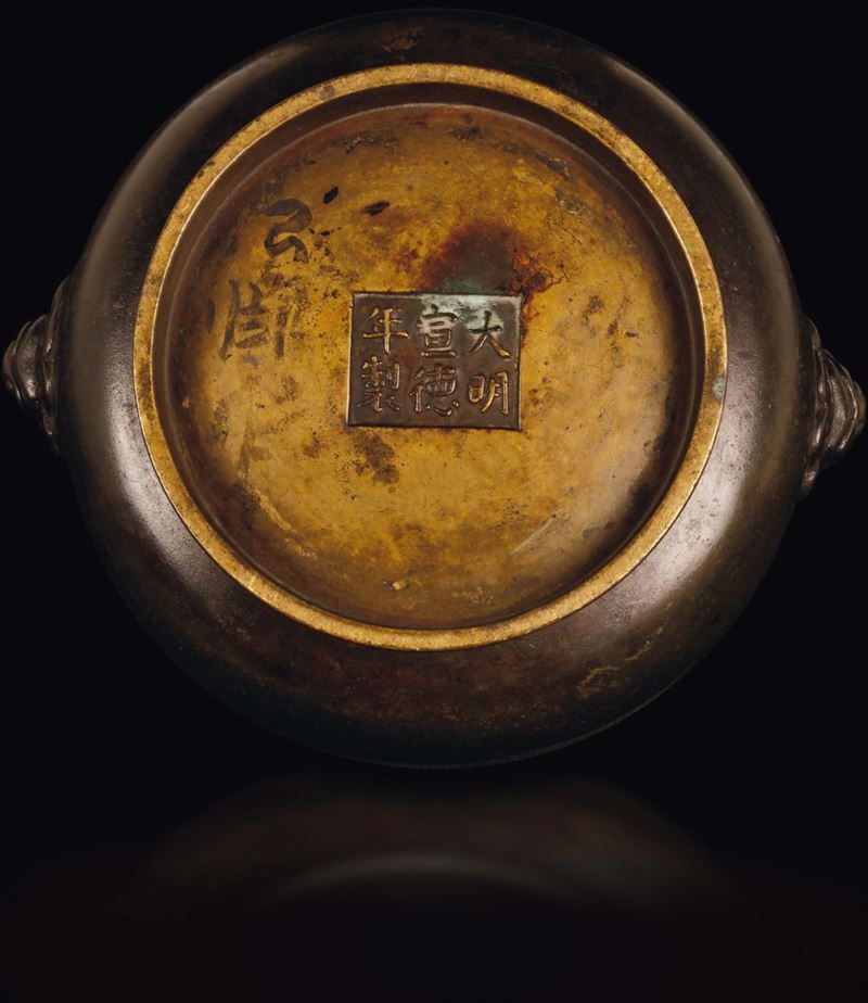A bronze censer with mask handles, China, Ming Dynasty, 17th century